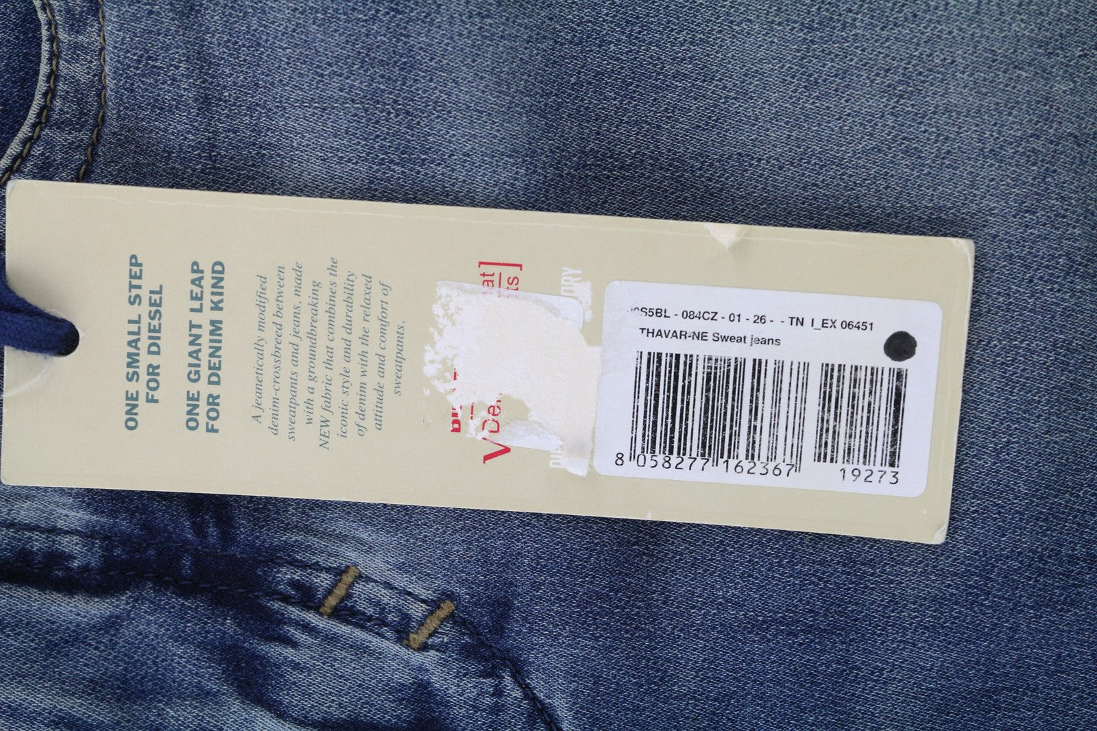 DIESEL Thavar-Ne 084CZ vyriški džinsai W26 Jogg Sweat Slim Fit su skalbtais užtrauktukais, mėlyni