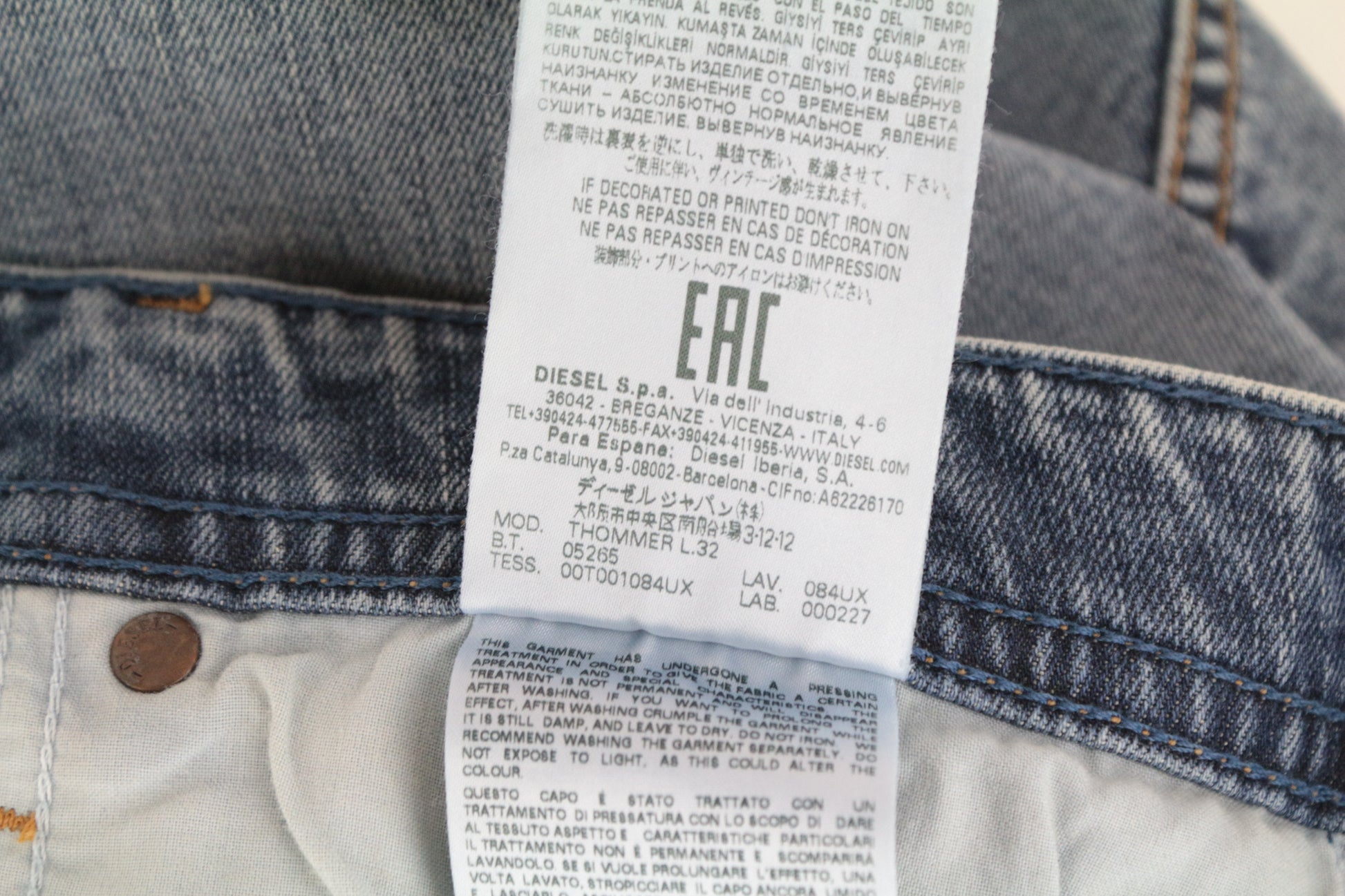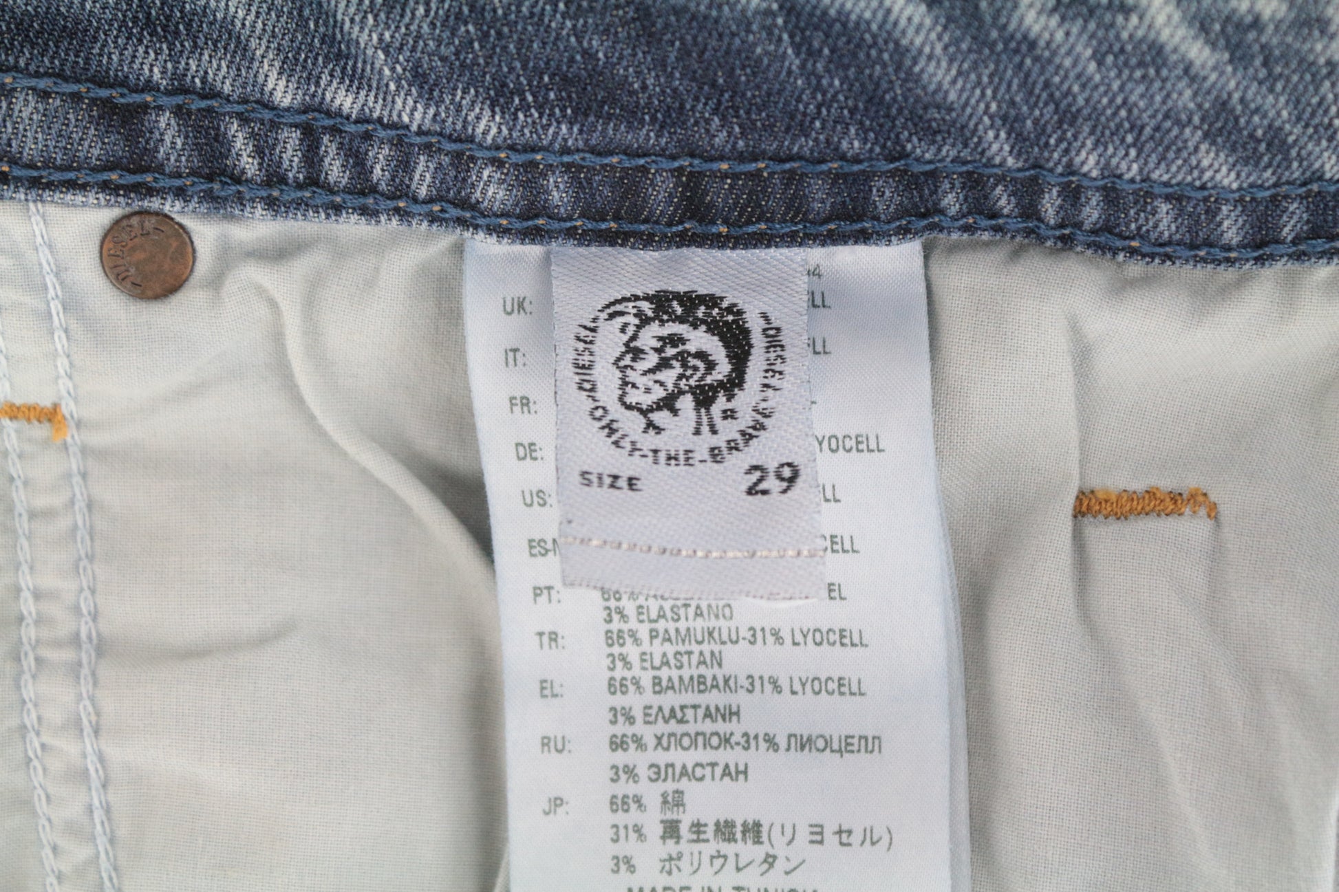 DIESEL Thommer 084UX vyriški džinsai W29/L33 mėlyni akmens plovimo ploni aptempti dėmių užtrauktuku