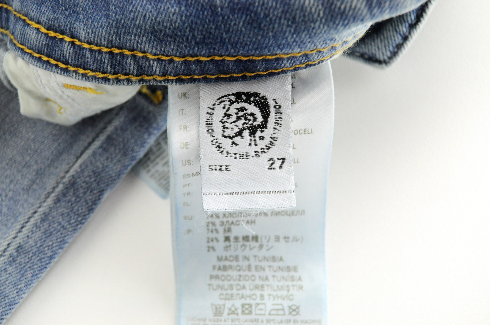 DIESEL Thommer 087AX vyriški mėlyni džinsai W27/L32 plėšyti, skalbti, ploni, aptempti džinsai