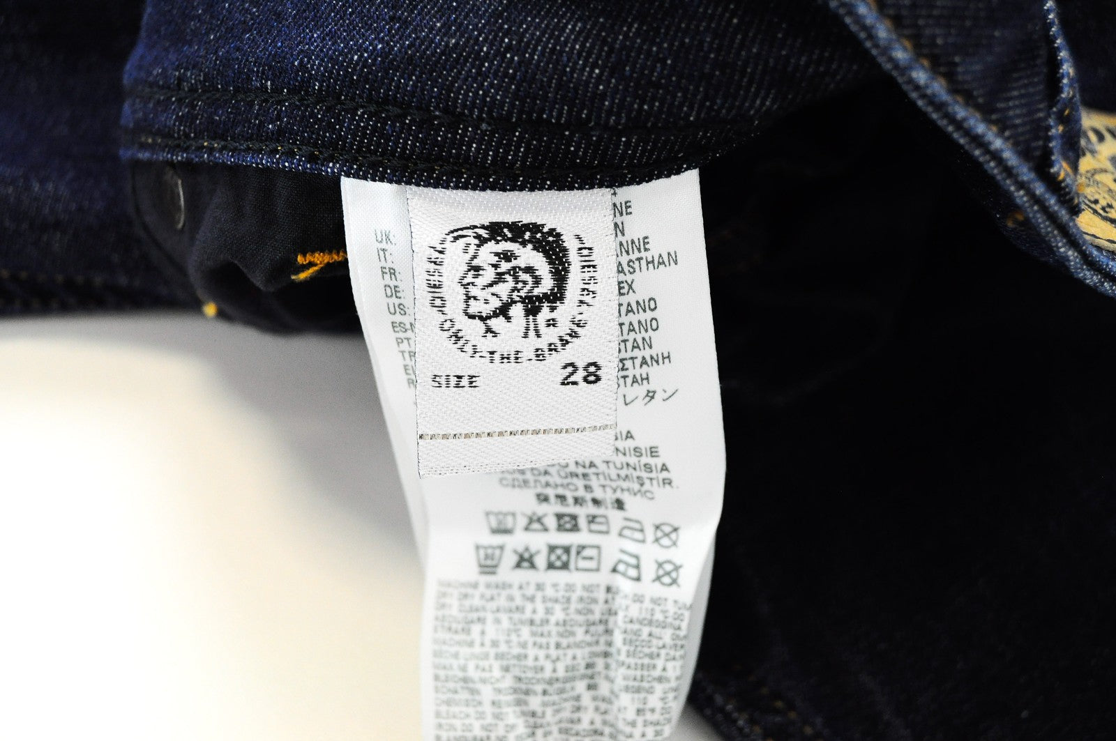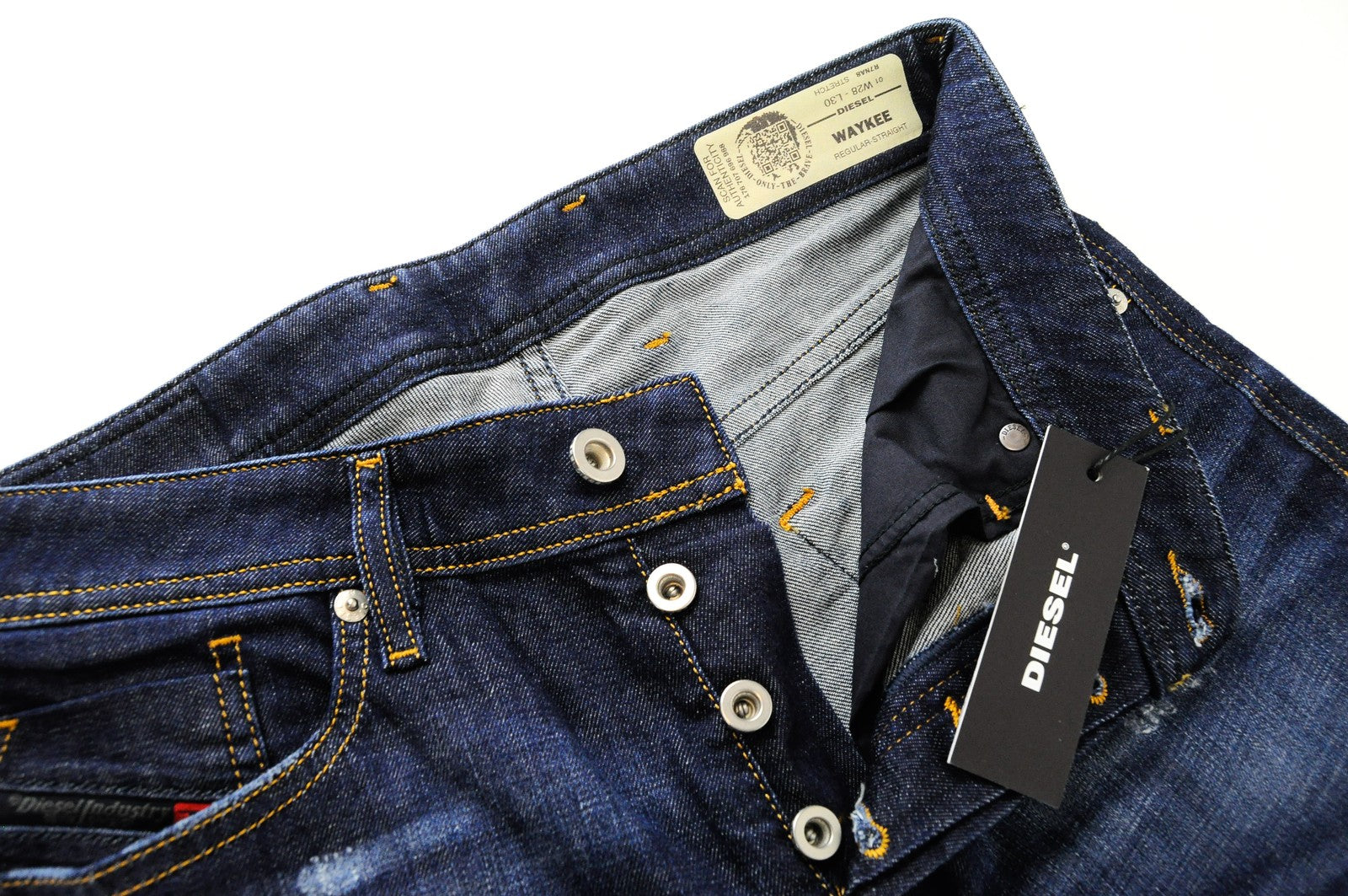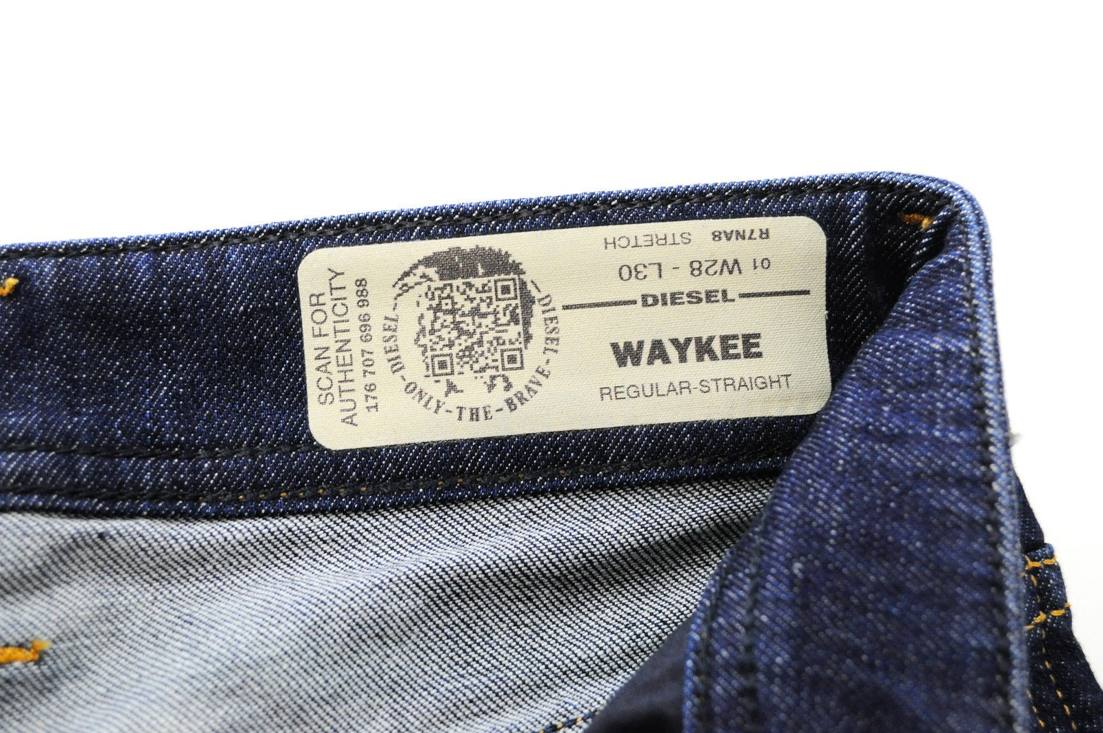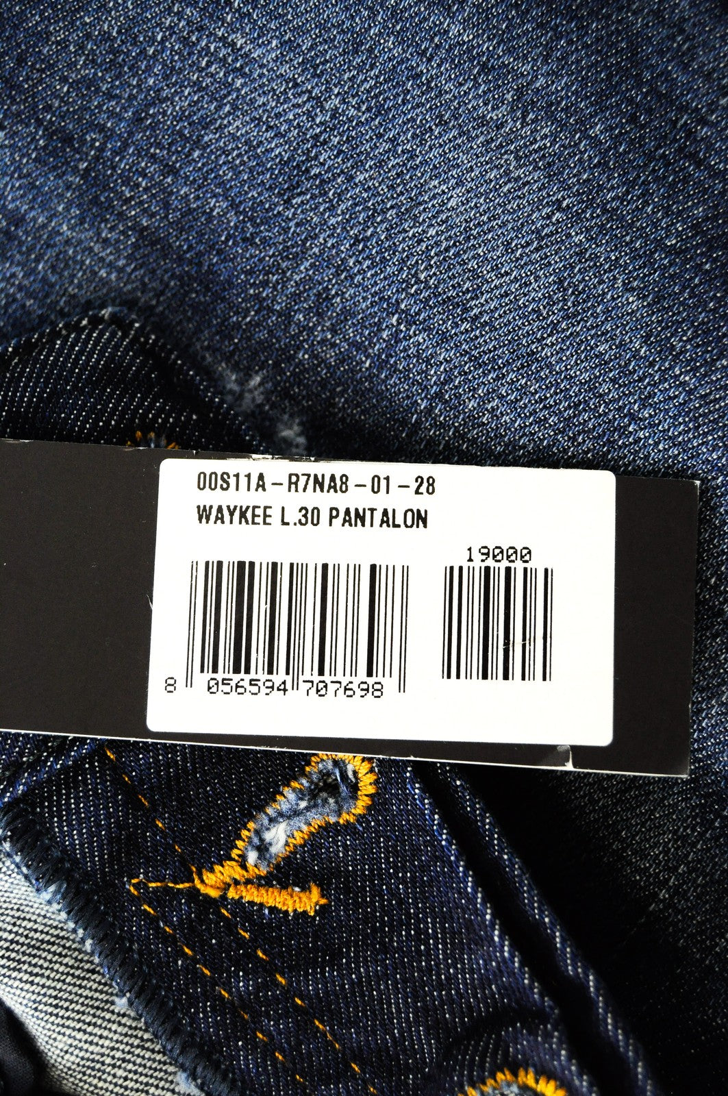 DIESEL Waykee R7NA8 vyriški džinsai W28/L30, skalbtos tamsiai mėlynos medvilnės, tiesios klešnės
