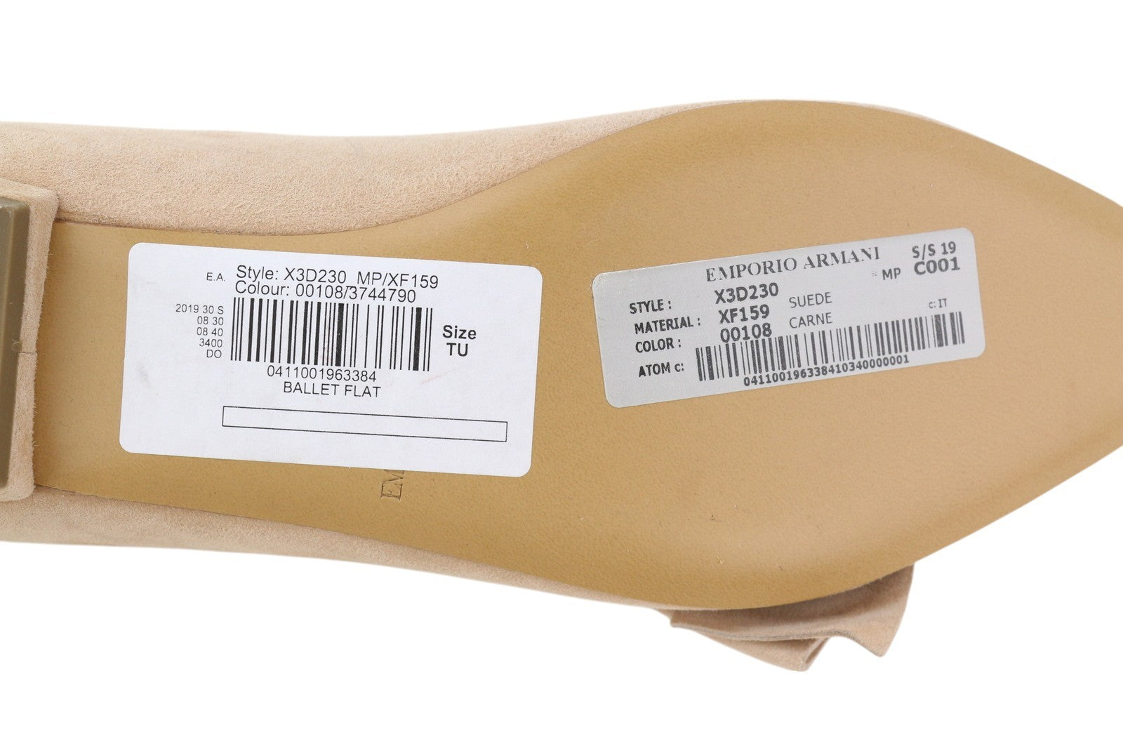 EMPORIO ARMANI X3D230 moteriški bateliai su smėlio spalvos zomša ir oda, smailiais pirštais ir kaspinėliais.