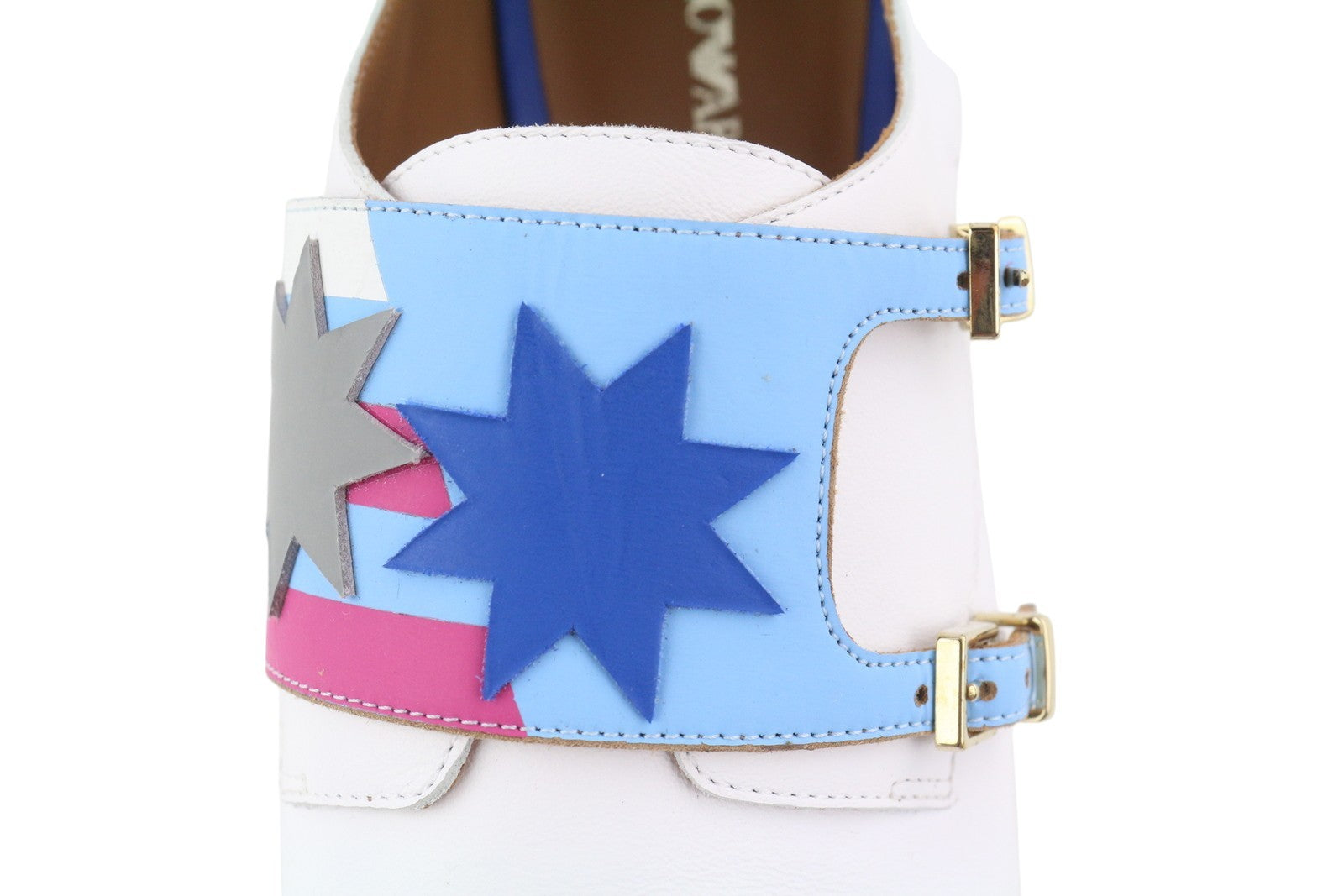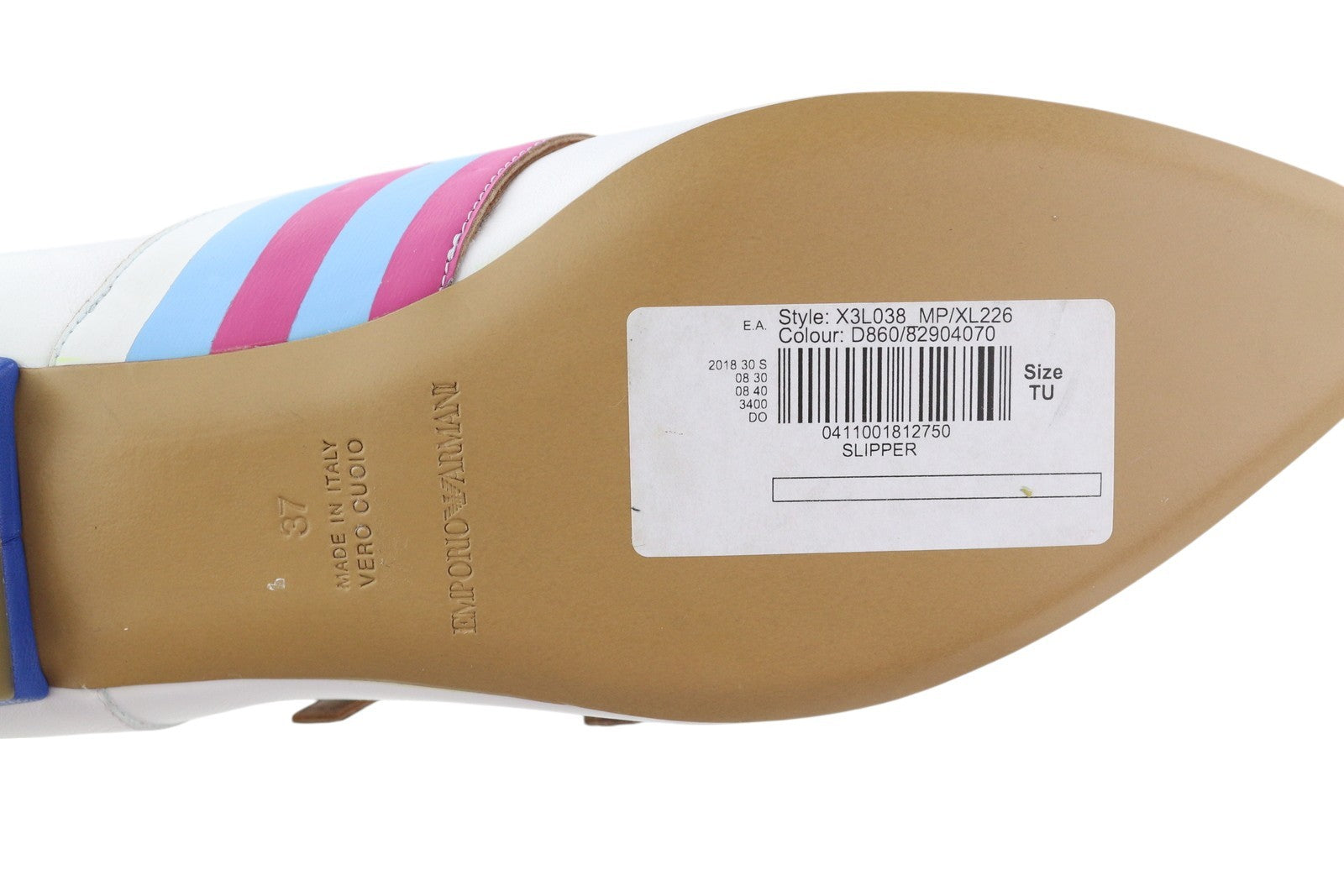EMPORIO ARMANI X3L038 moteriški bateliai su baltos odos dvigubu dirželiu ir smailiu dirželiu.