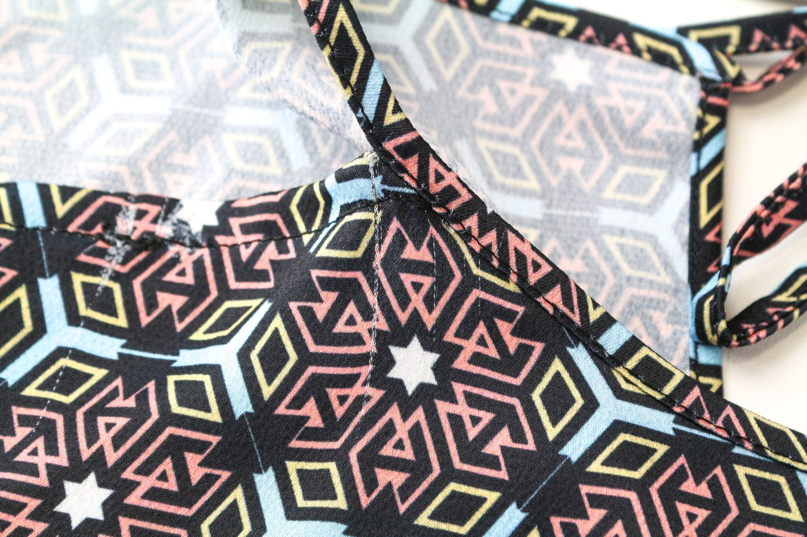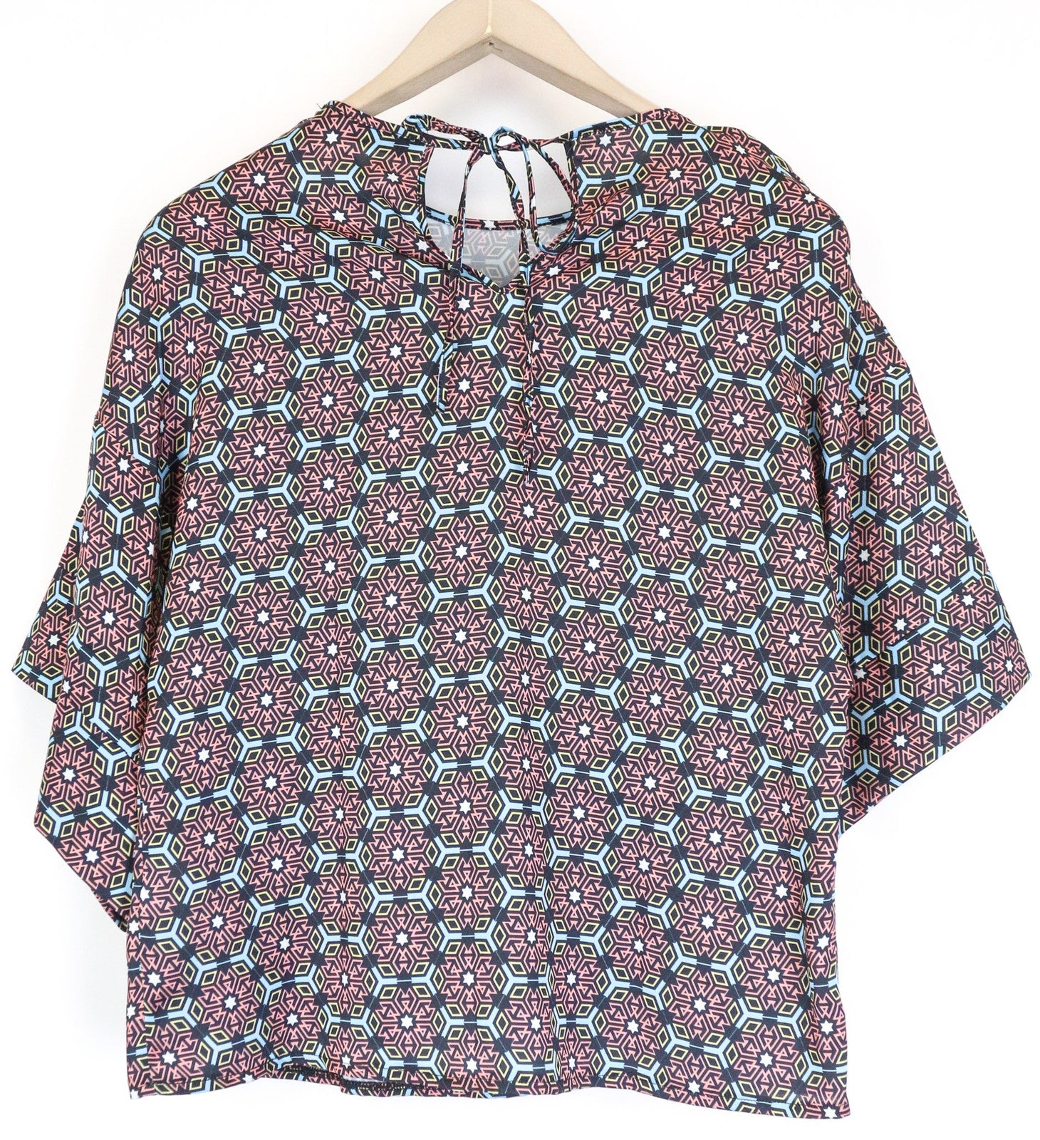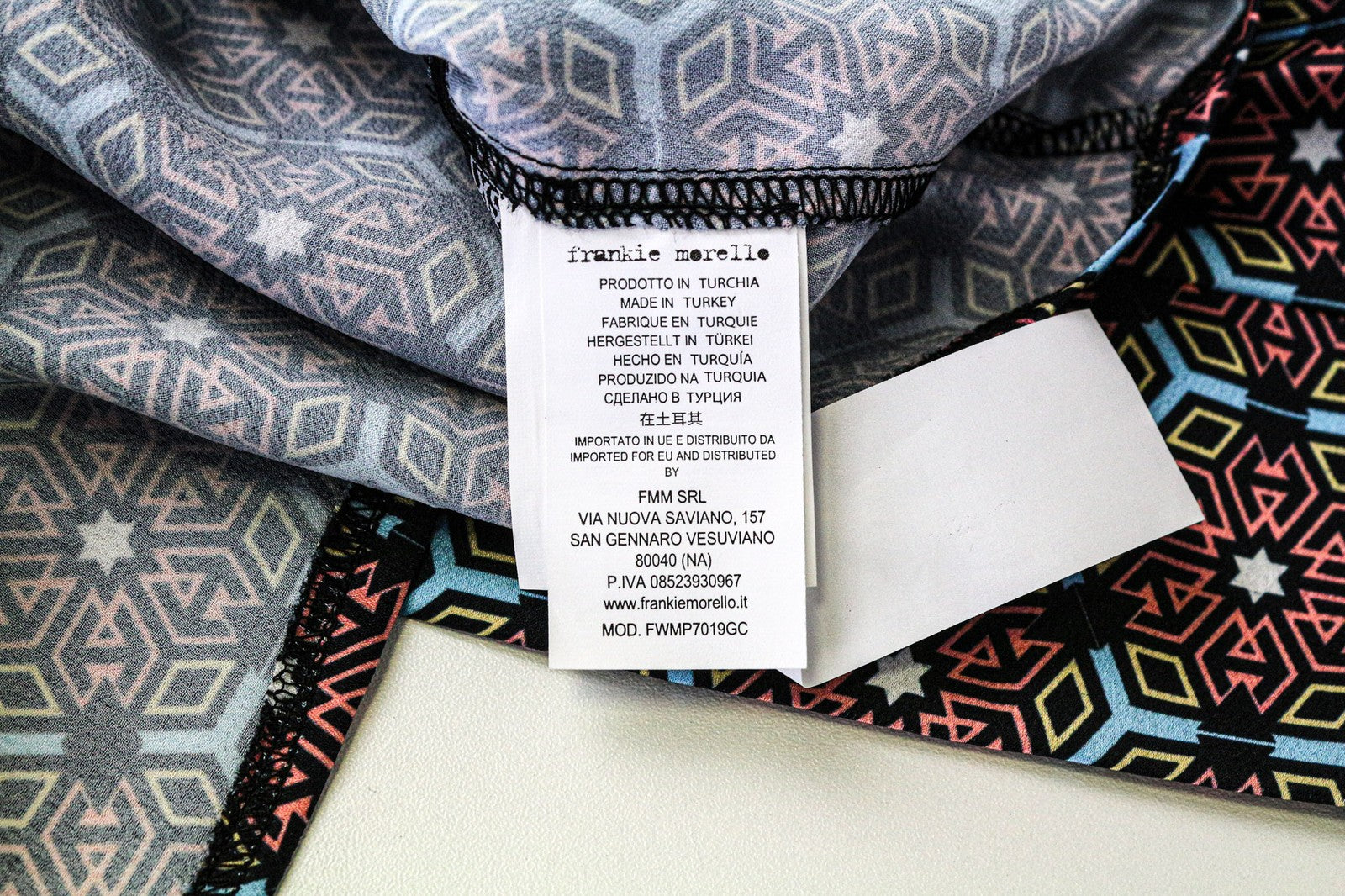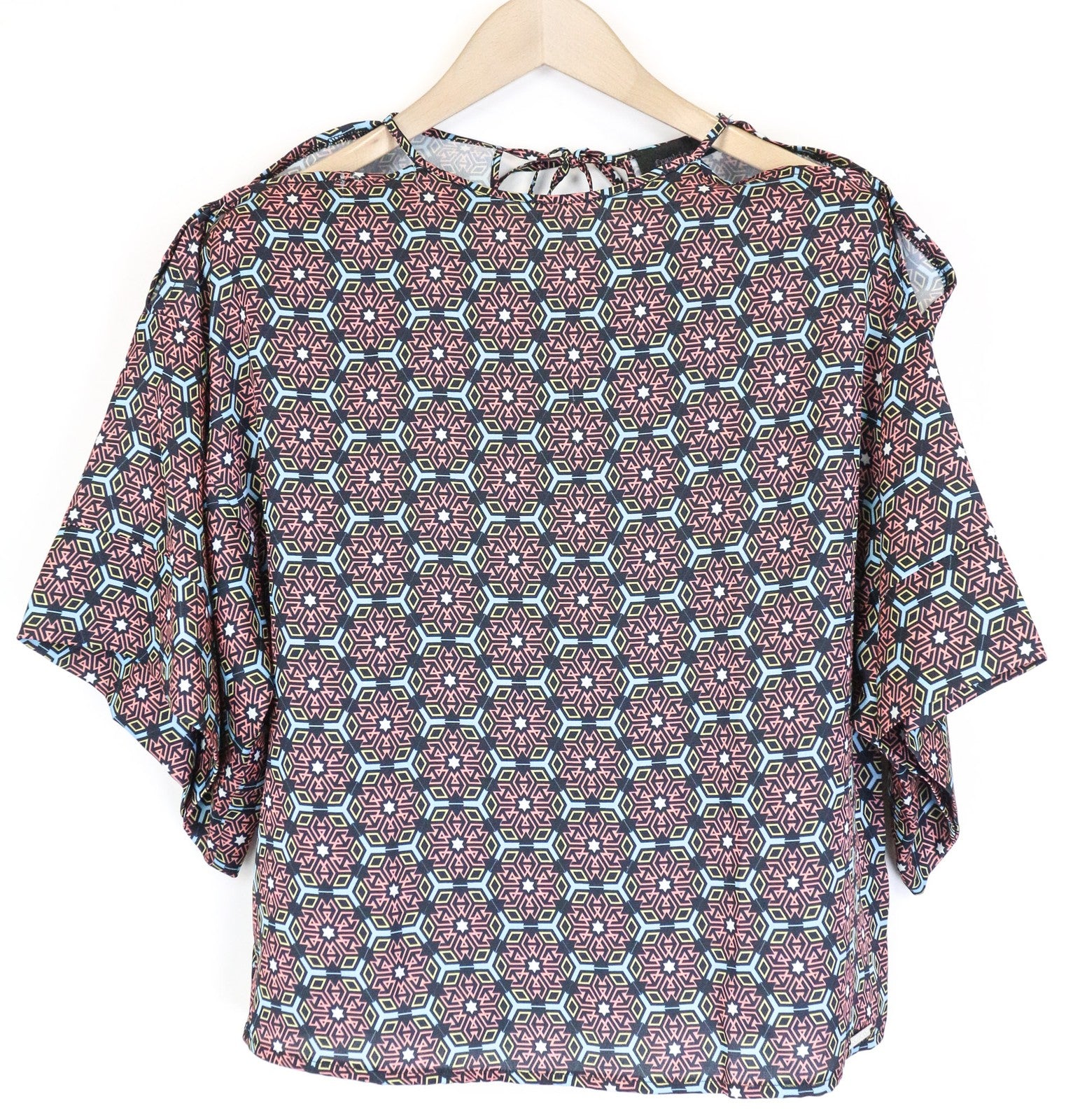 FRANKIE MORELLO moteriški marškinėliai XS dydžio, juodi, šaltais pečiais, laisvo kirpimo, geometrinio rašto.