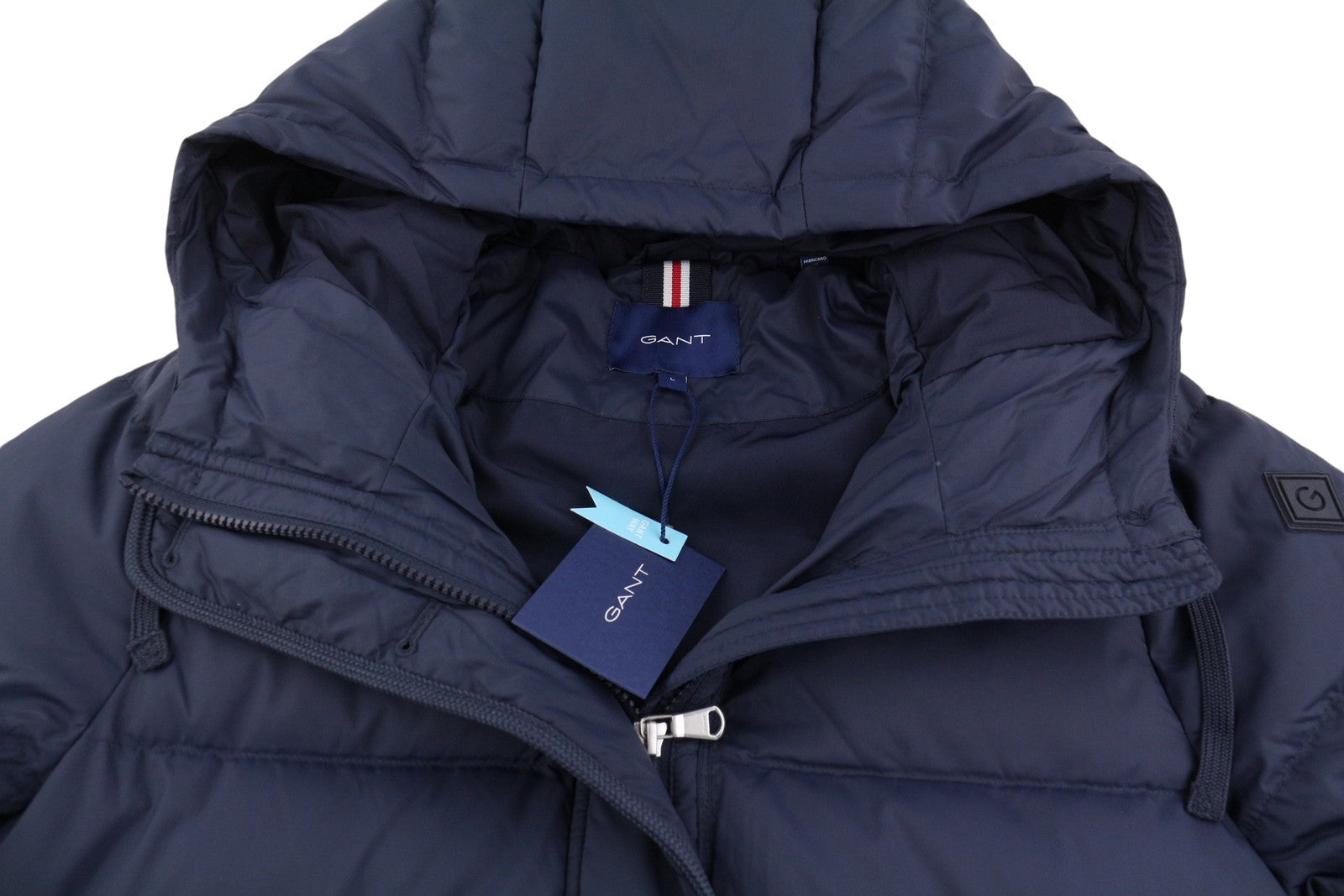 GANT Long Down Women Jacket L Evening Blue Quilted Hooded Mid Coat