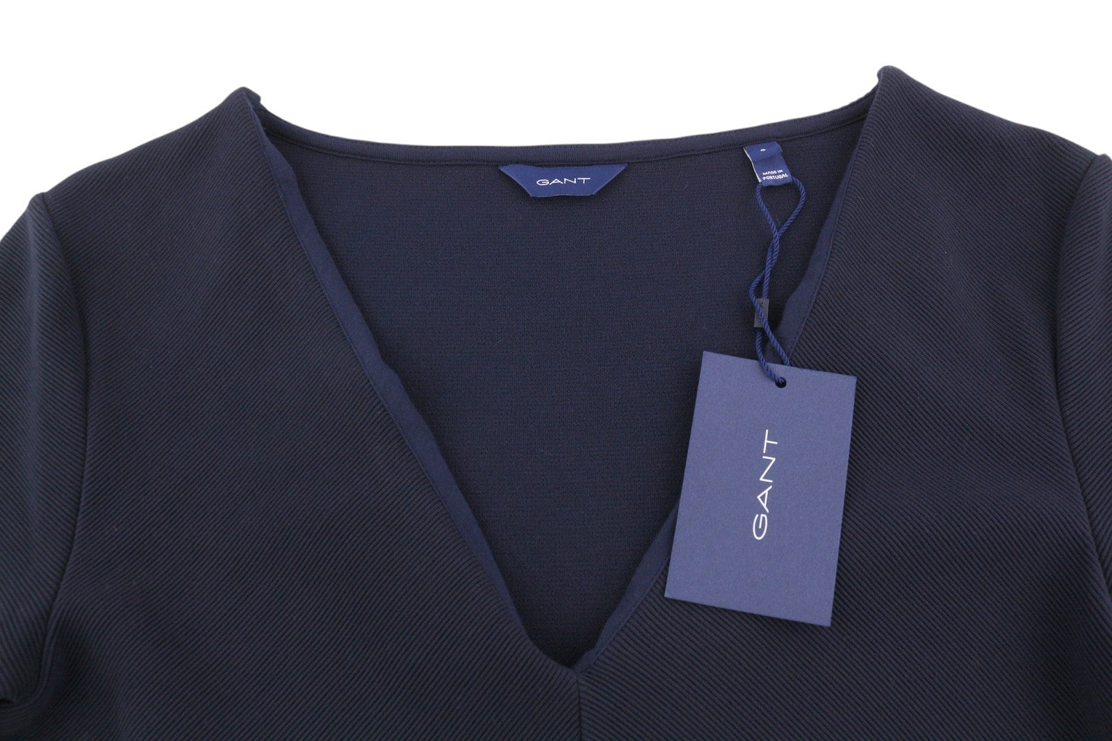 GANT Rib Structure moteriška suknelė S mėlyna trumpomis rankovėmis, tampri V formos iškirpte, iki kelių