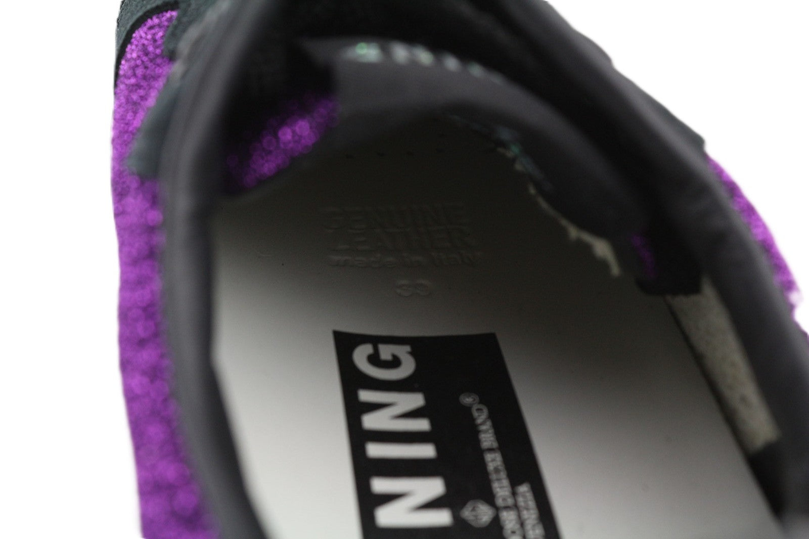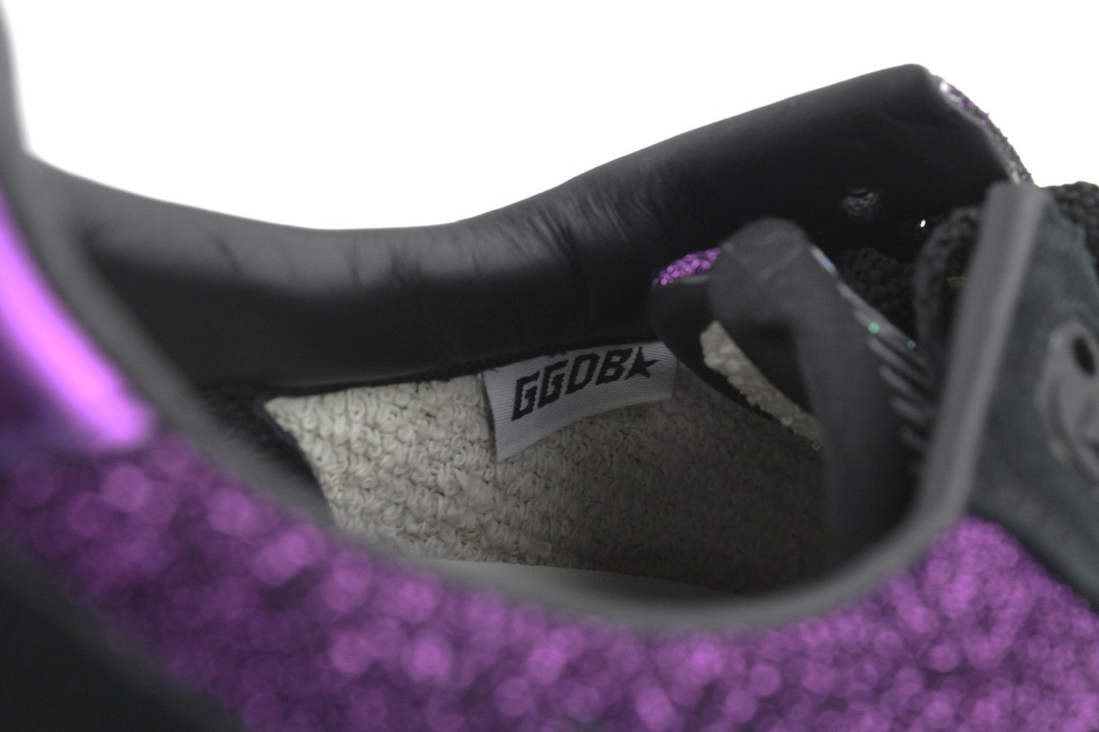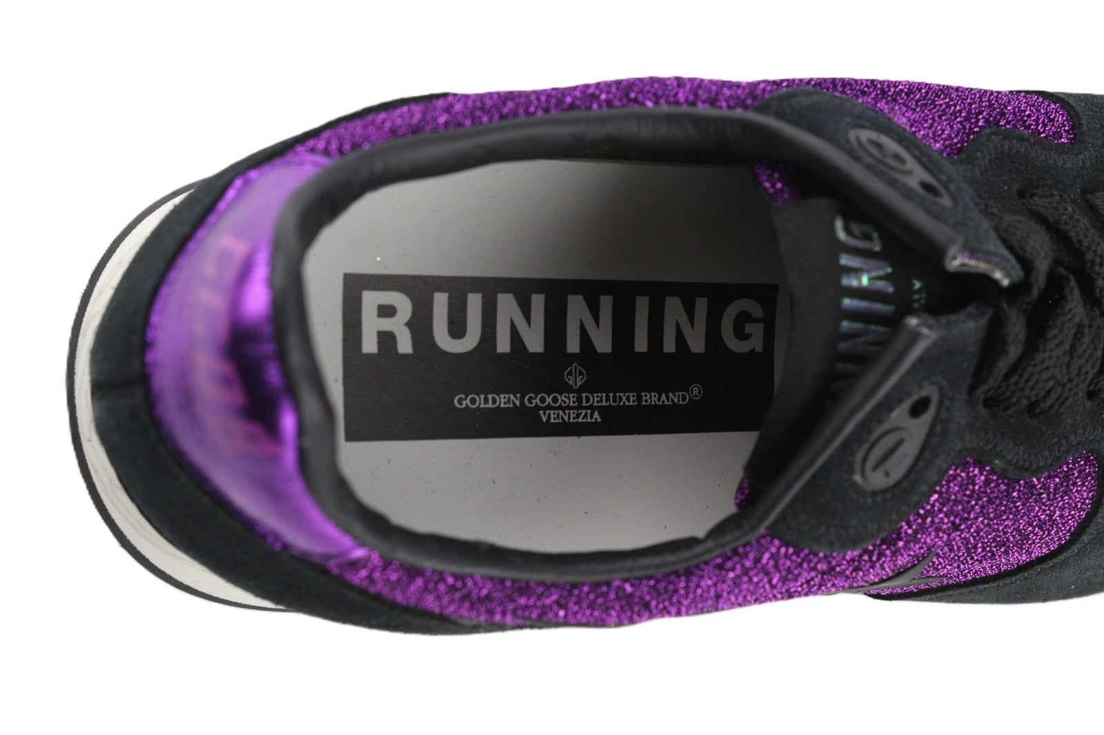 „GOLDEN GOOSE“ bėgimo bateliai moterims, 39 dydžio, violetiniai, juodi, odiniai, blizgantys, suvarstomi.