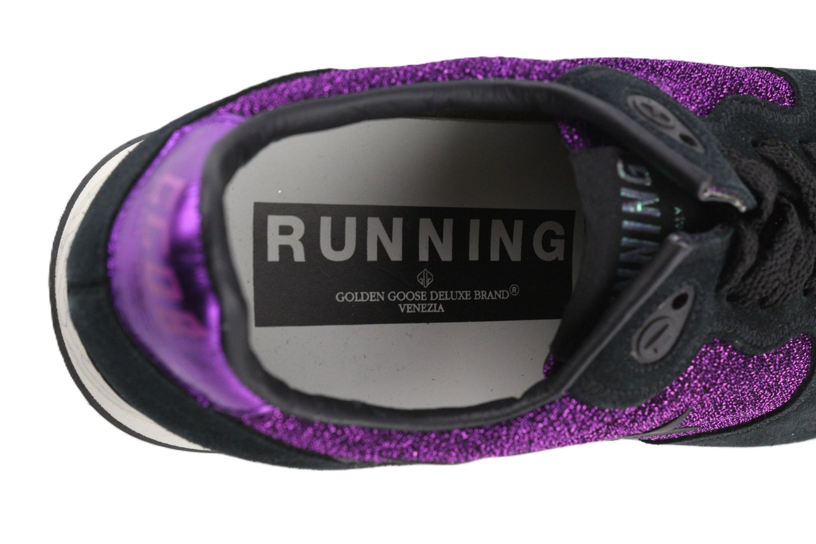 „GOLDEN GOOSE“ bėgimo bateliai moterims, 39 dydžio, violetiniai, juodi, odiniai, su blizgančiais raišteliais.