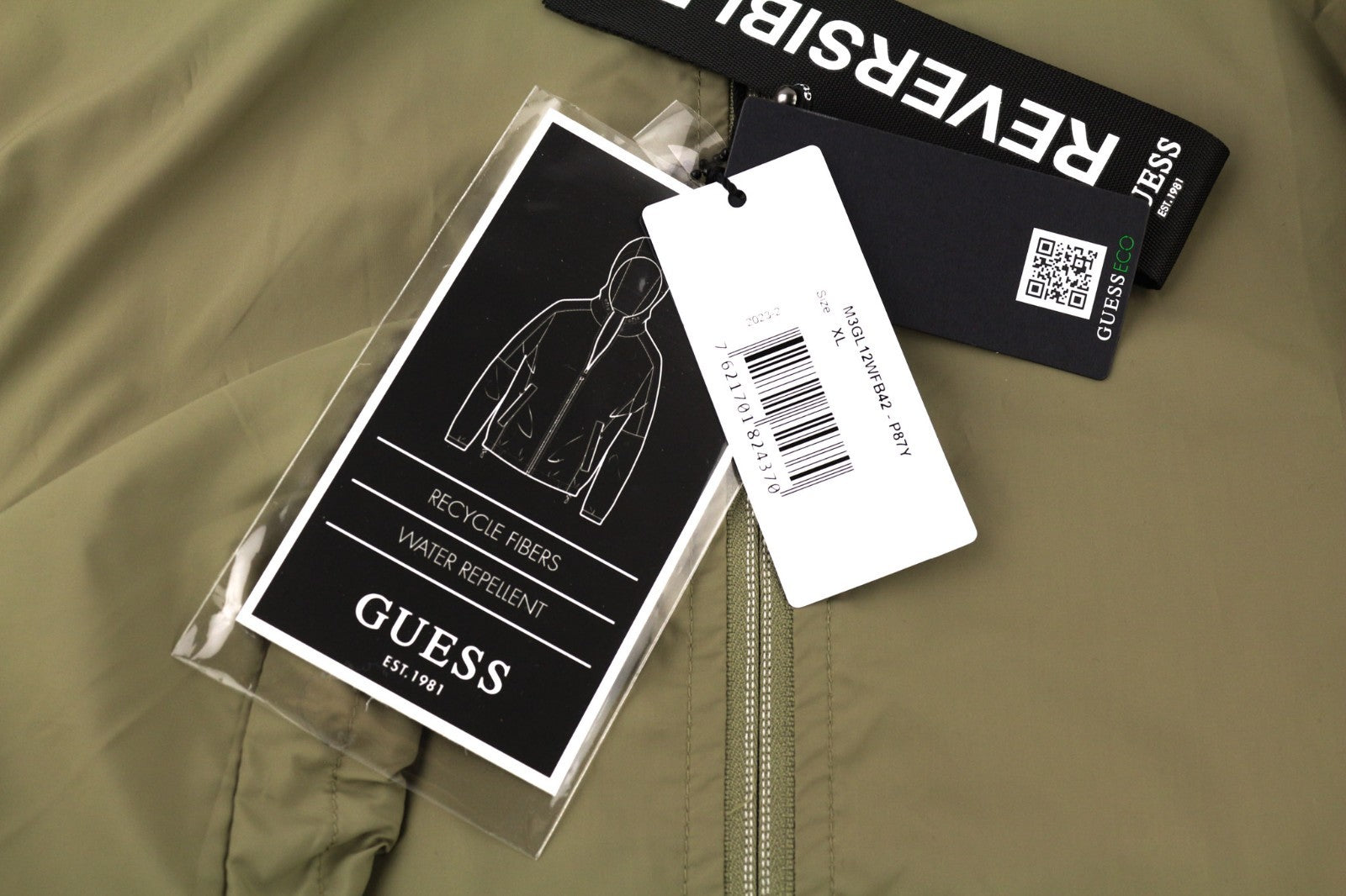 GUESS vyriška striukė XL dydžio, dvipusė, lengva, su gobtuvu, perdirbta, vandeniui atspari