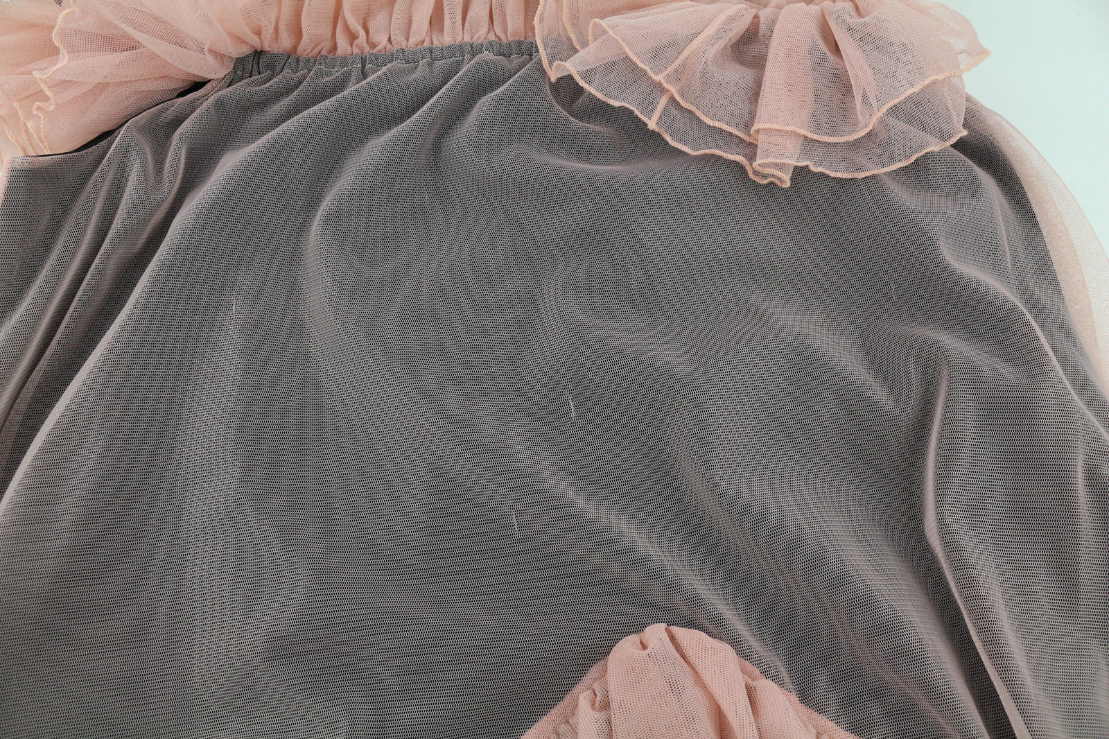 GUGLIELMO CAPONE lėlių moteriška suknelė 42 rožinė be rankovių tiulio su raukiniais ir logotipu, Midi ilgio