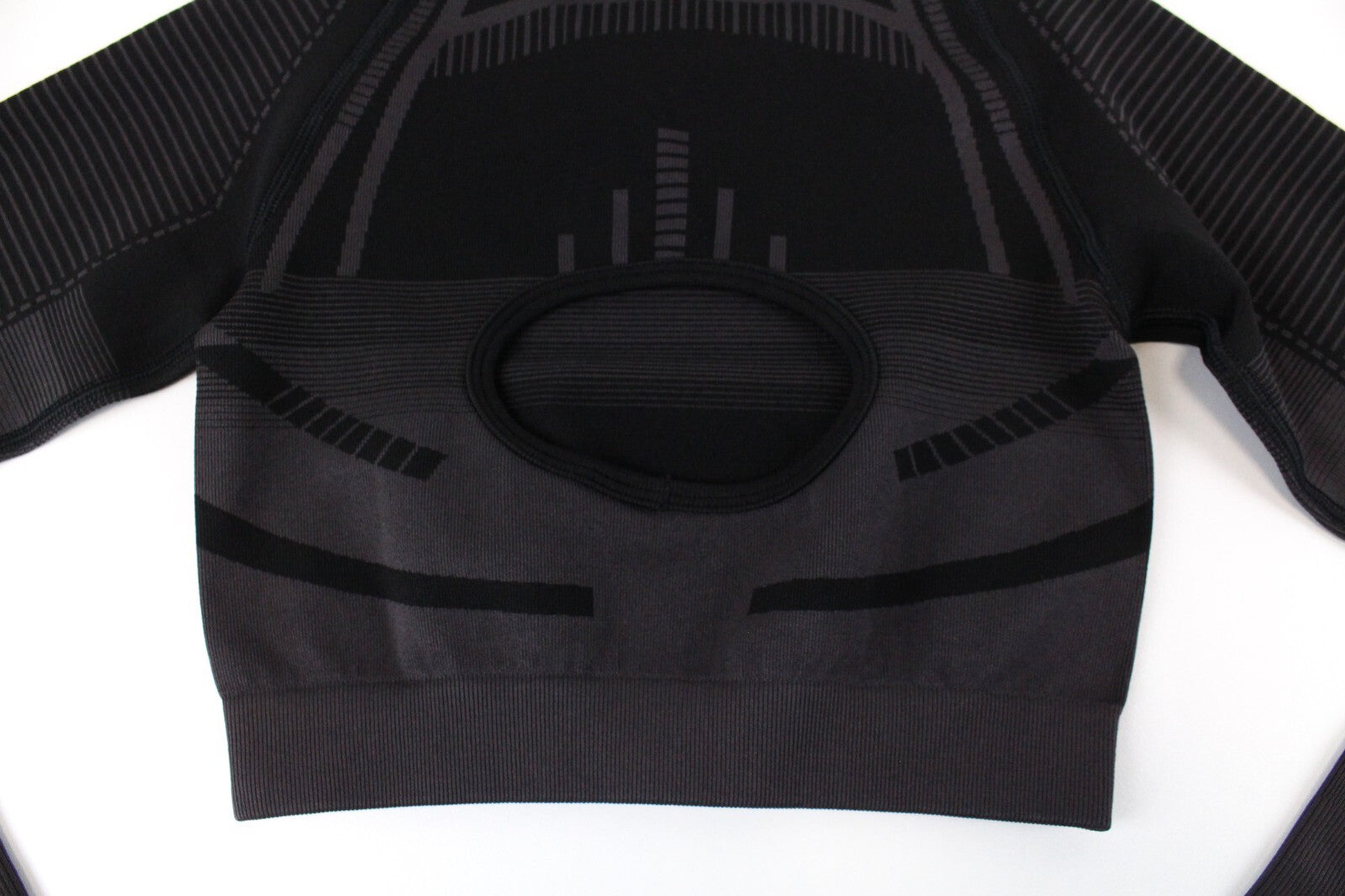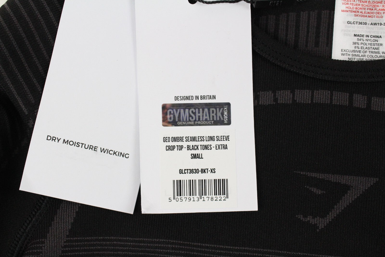 GYMSHARK Geo moteriški marškinėliai XS dydžio, juodi, ilgomis rankovėmis, trumpinti, tamprūs sportiniai marškinėliai