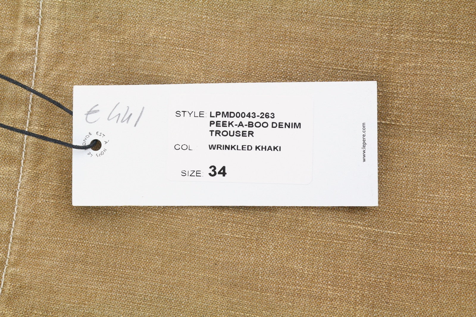 LE PERE Peek-A-Boo džinsinės vyriškos kelnės W34 smėlio spalvos raukšlėtos chaki spalvos krovininės RRP550