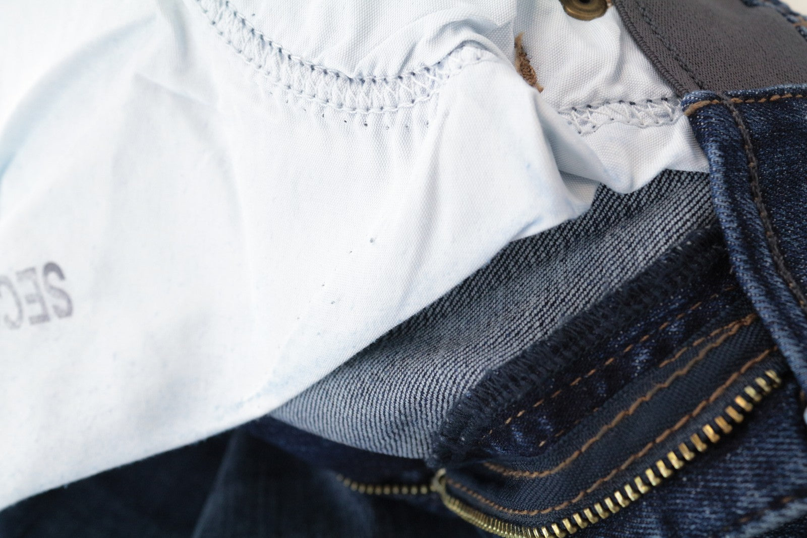 SĄLYGA: New with defects. Stain on the left leg, tear in the back. Dyed pockets' lining. Please see added photos.
