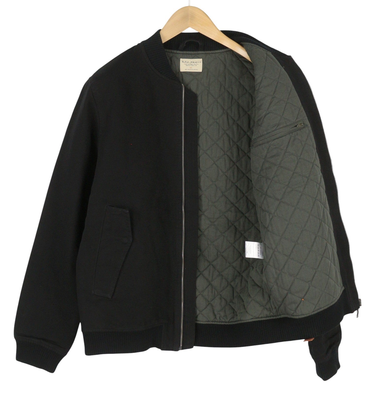 NUDIE JEANS vyriška striukė M, juoda, su pilnu užtrauktuku, užlopytomis kišenėmis, pamušalu, lengva bomber striukė