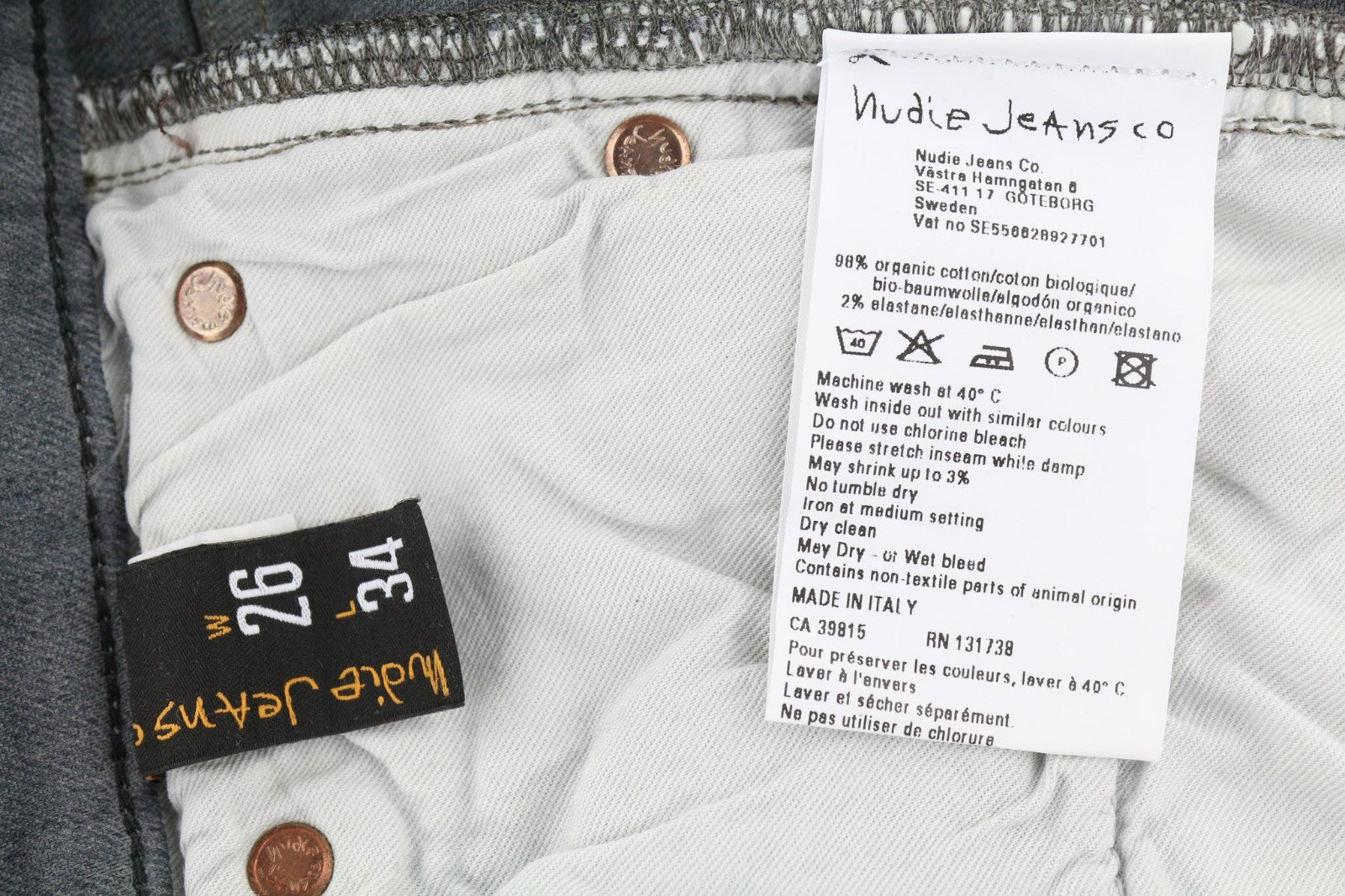 NUDIE JEANS aptempti ilgi moteriški džinsai W26/L34 tamsiai pilki, ploni, ekologiški