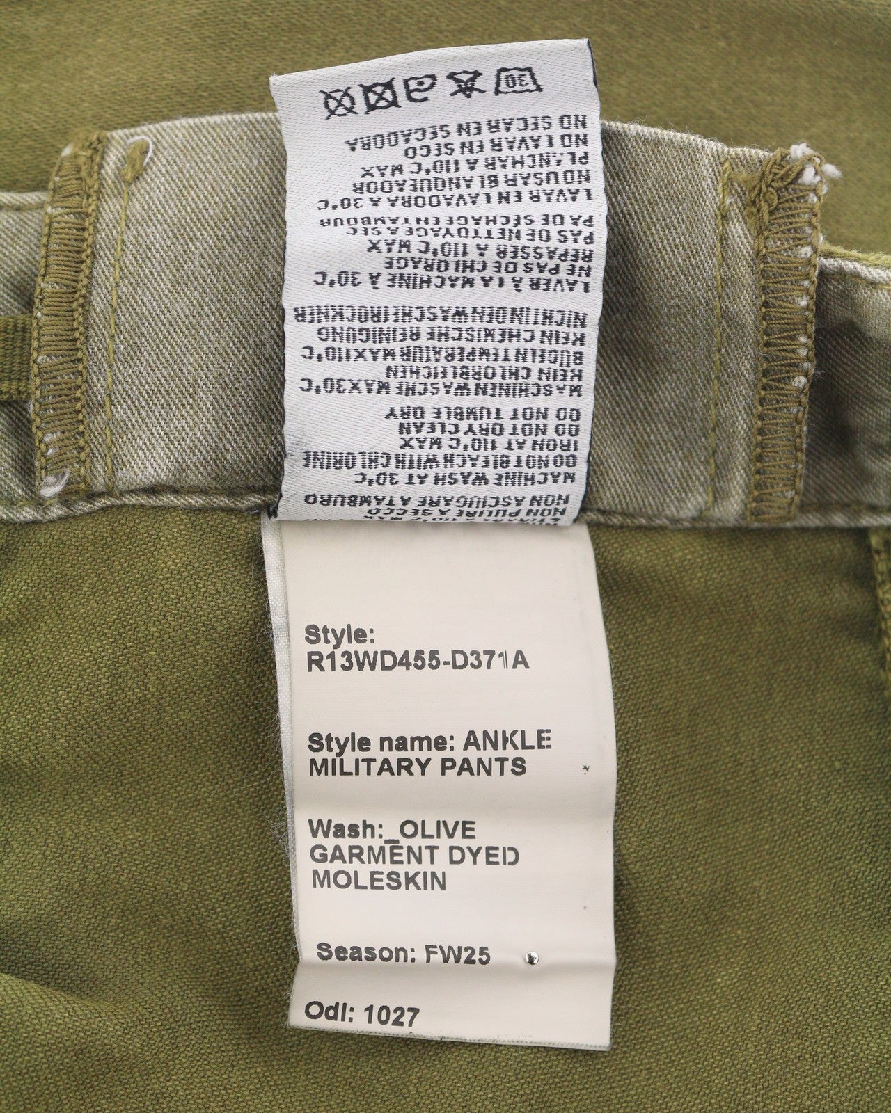R13 kulkšnies karinės moteriškos kelnės 27 alyvuogių spalvos dažyta moleskine FW25 RRP1199