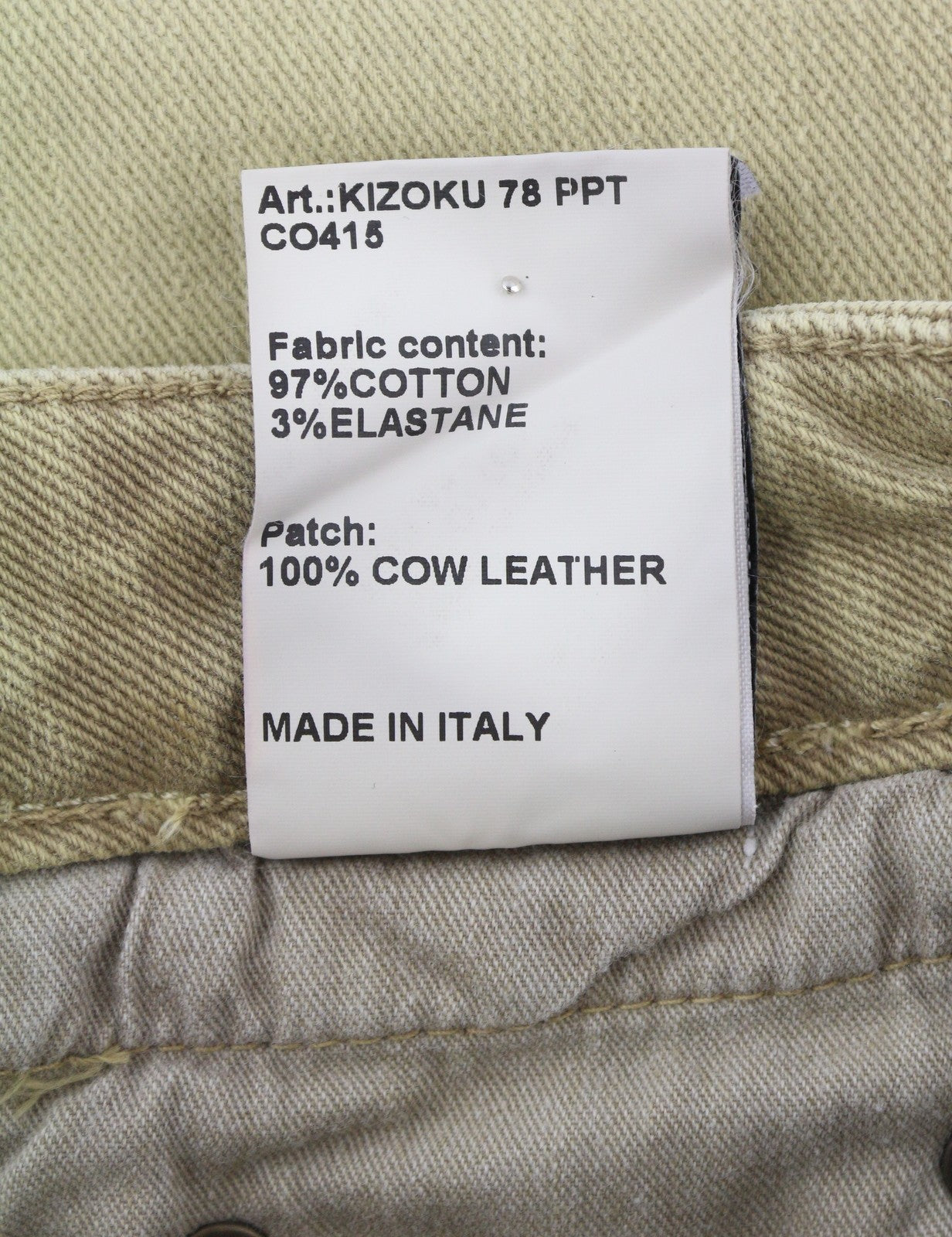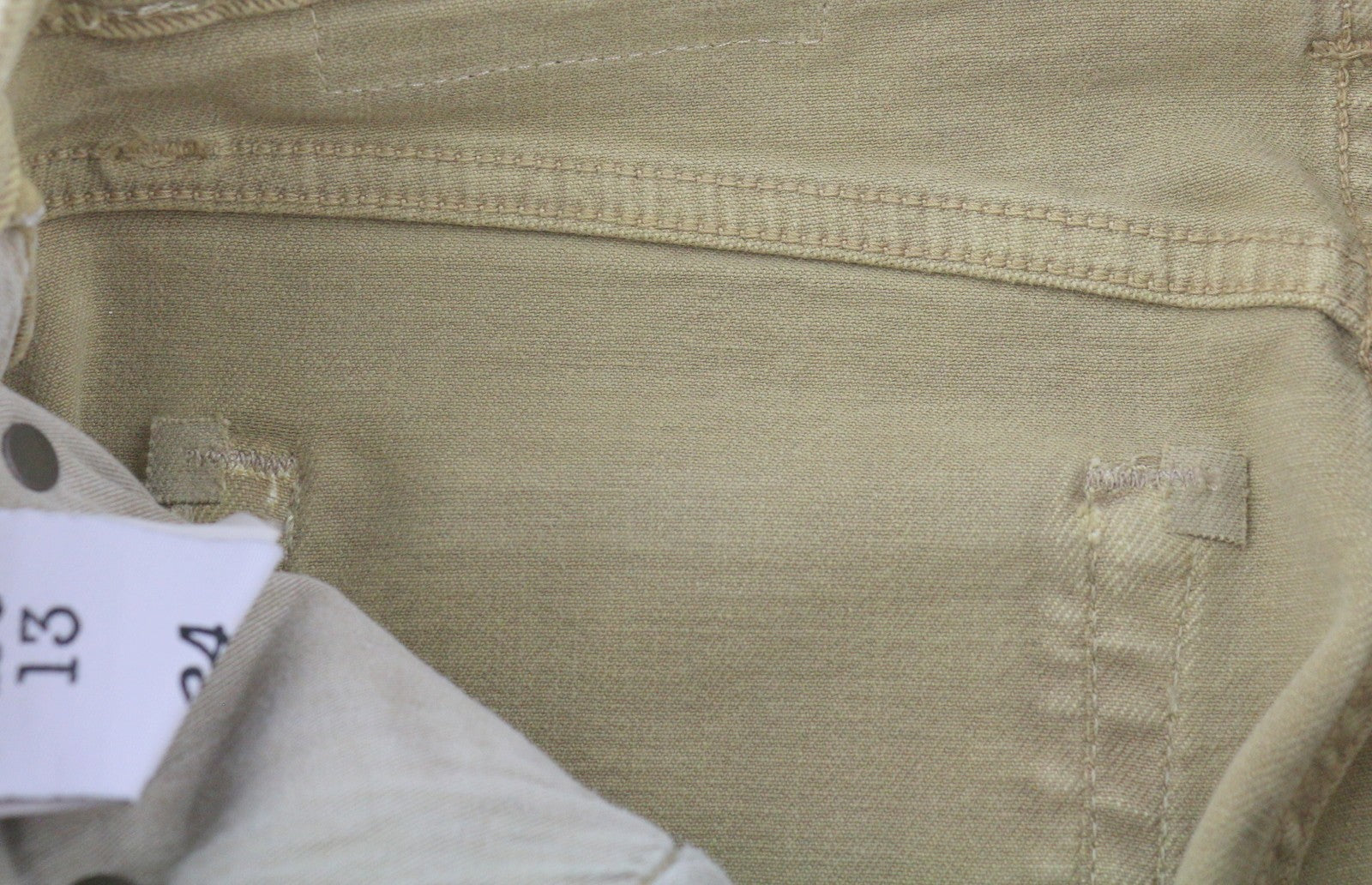 A professional seamstress repaired the defects on the back pockets corners. The material is slightly waved (elastane is stretch out) in a few places. Please see added photos.
