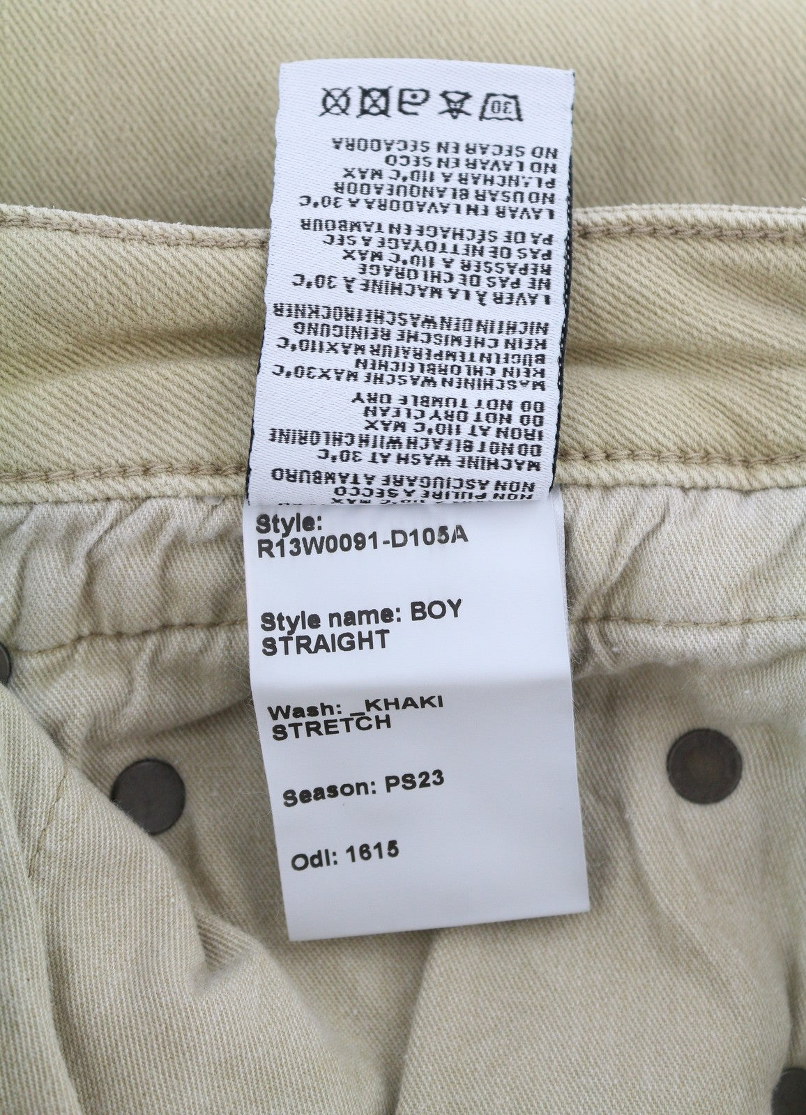 R13 berniukiški tiesūs moteriški džinsai, 25 chaki spalvos, tamprūs, išblukę, trumpi, iki kulkšnių, rekomenduojama kaina – 699 €