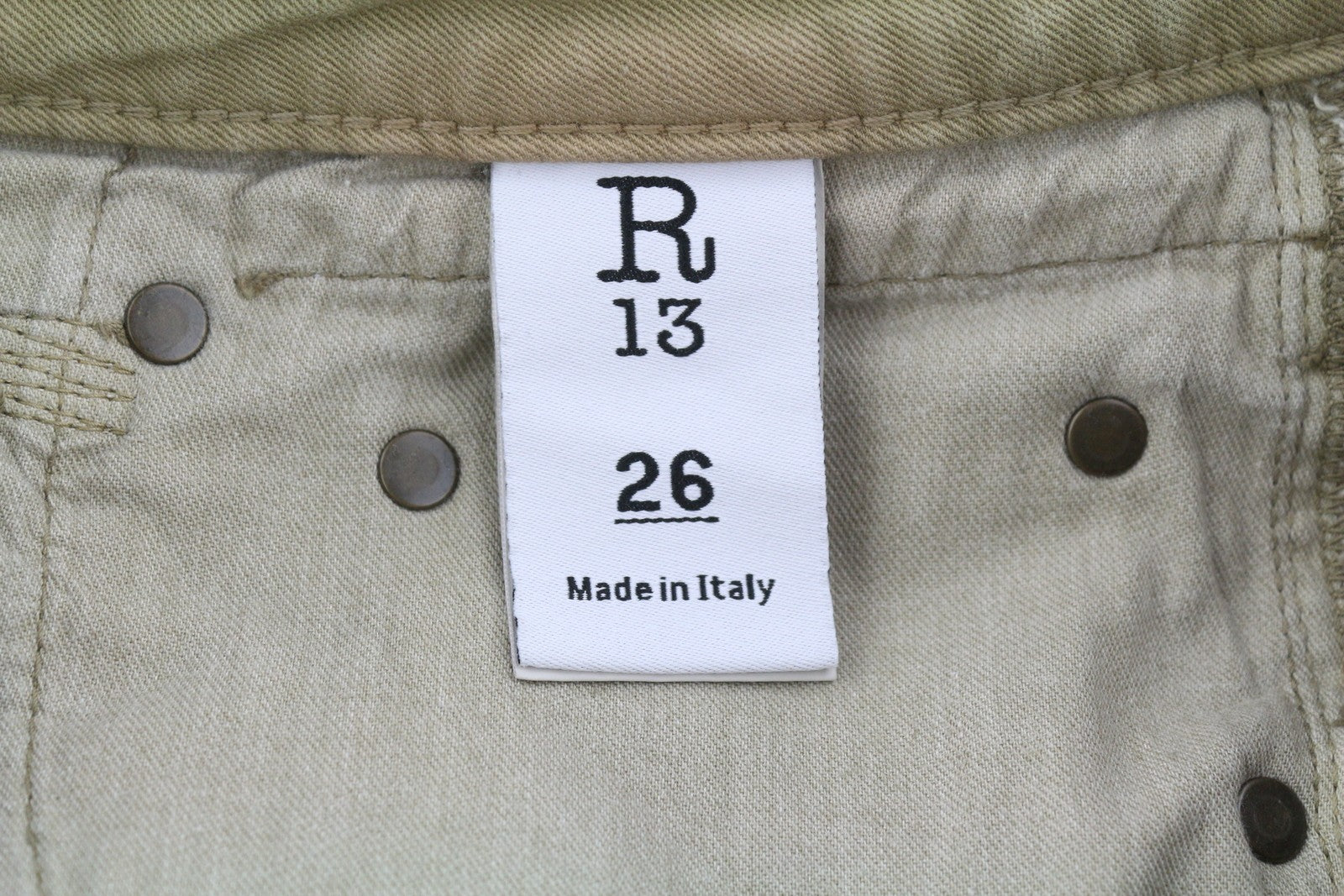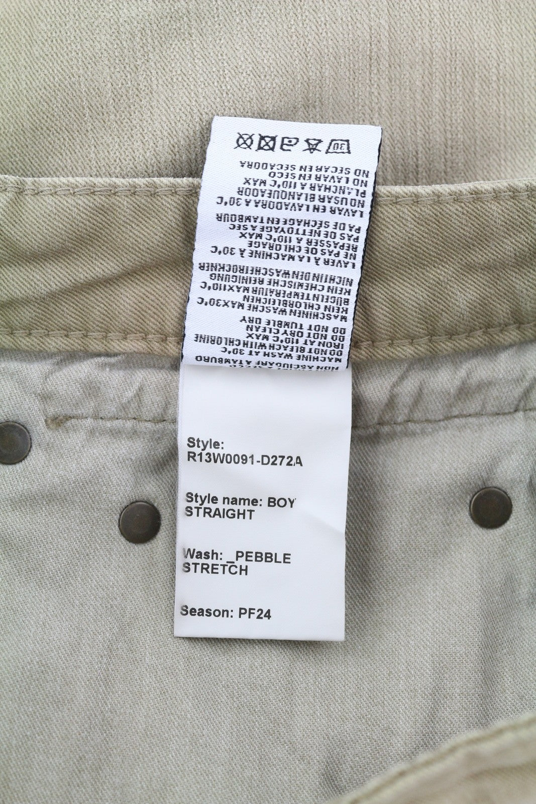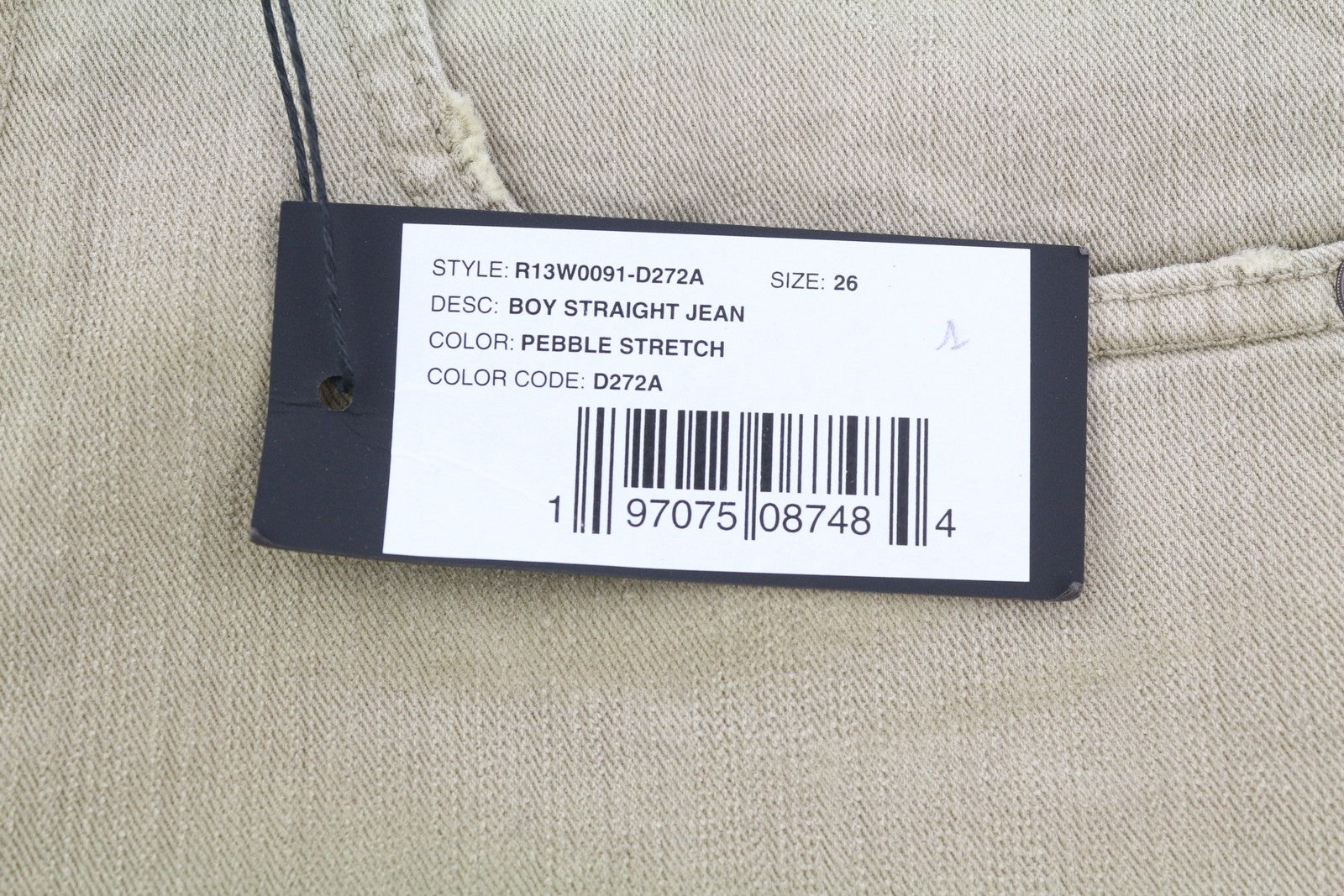 R13 berniukiški tiesūs moteriški džinsai 26 akmenukų spalvos, tamprūs, trumpi, išblukintos rudos spalvos, rekomenduojama kaina – 695 €
