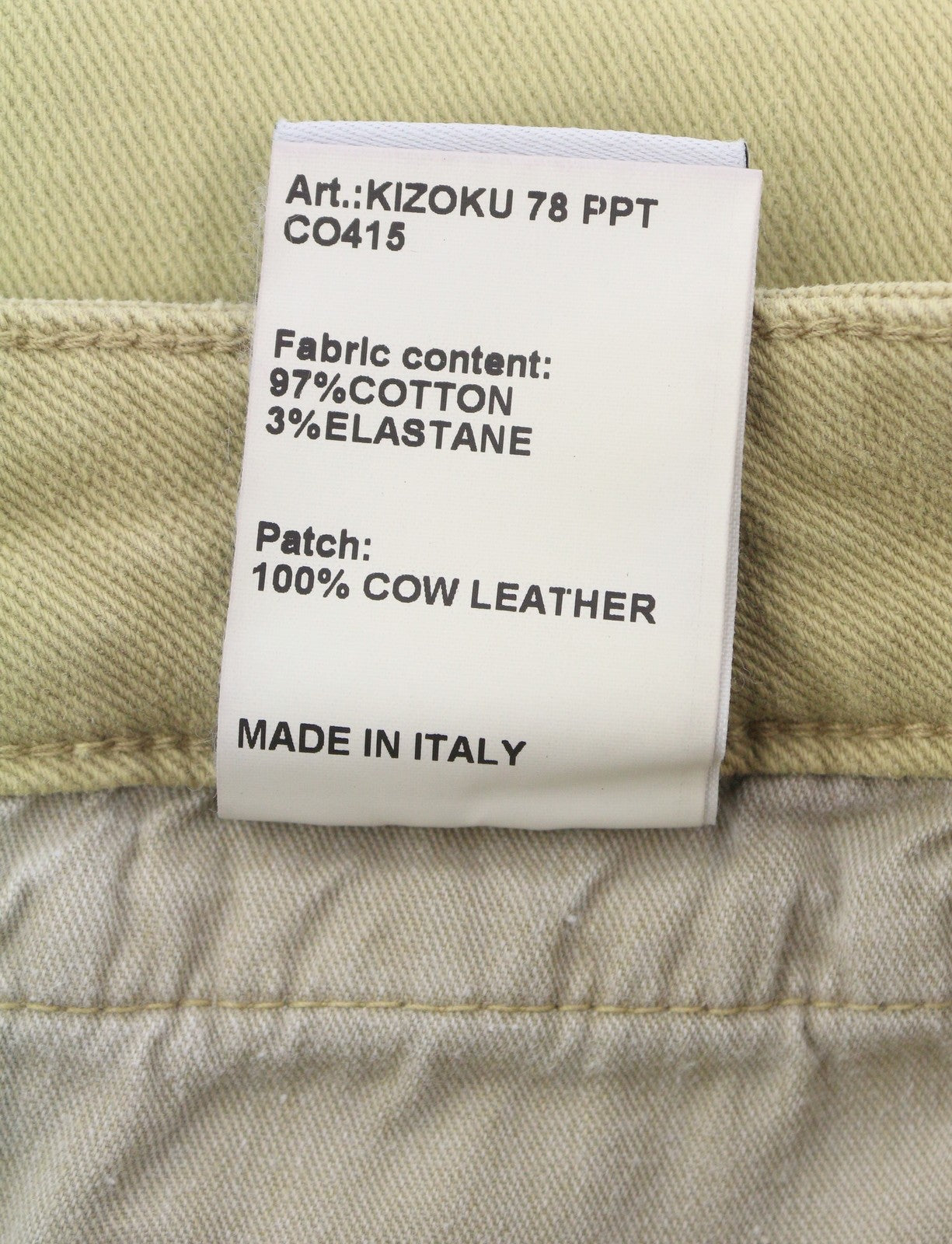 Condition: Slightly discoloured on the left leg. A professional seamstress repaired the defects on the back pockets corners. The material is slightly waved (elastane is stretch out) in a few places. Please see added photos.