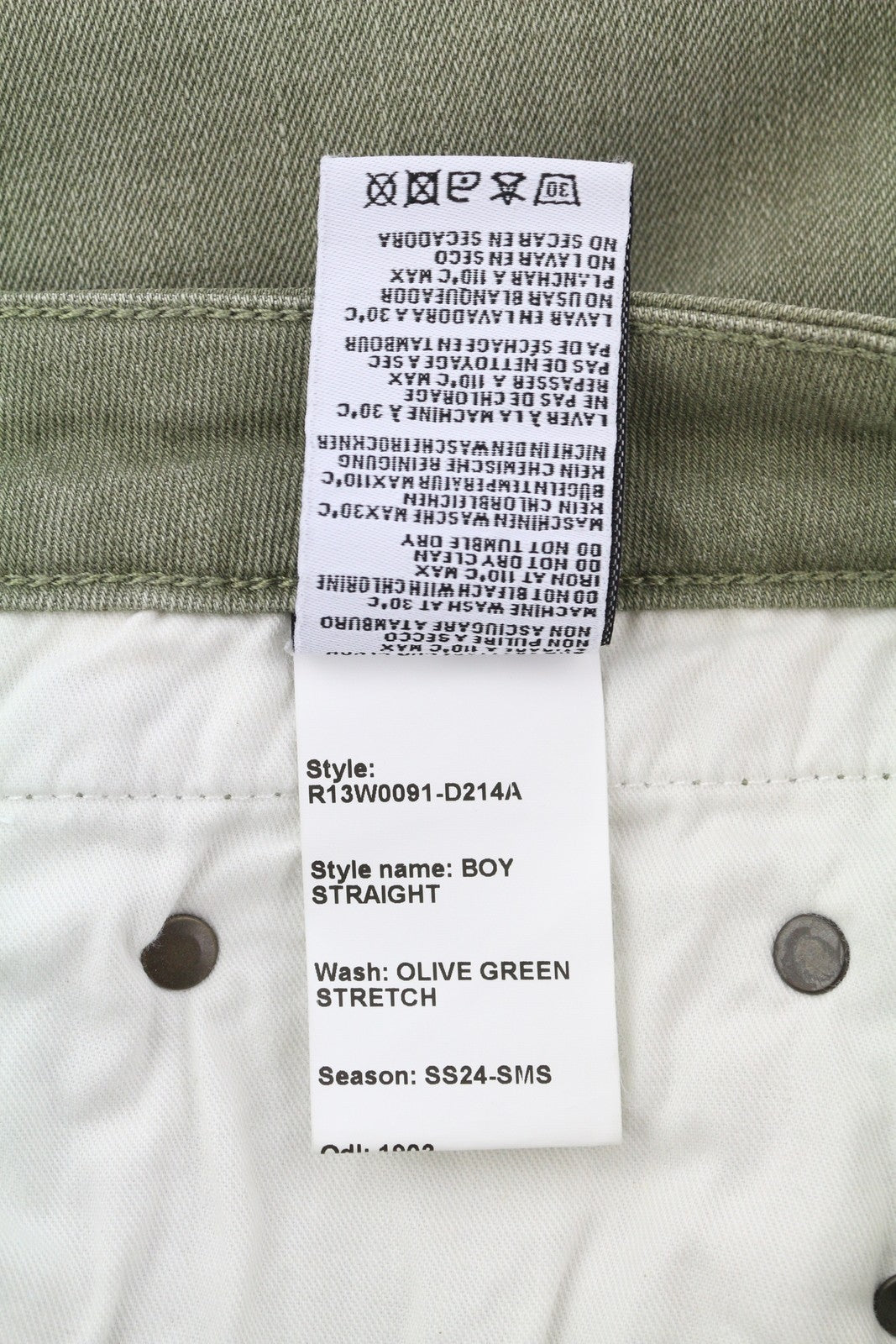 R13 berniukiški tiesūs moteriški džinsai 27 alyvuogių žalios spalvos, tamprūs, išblukę, trumpinti iki kulkšnių.