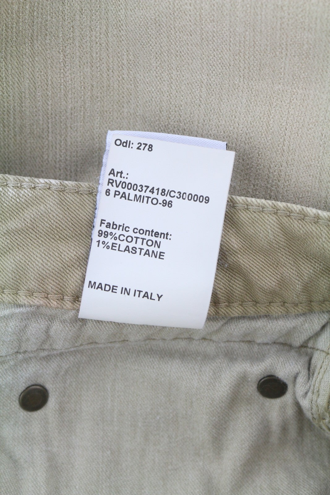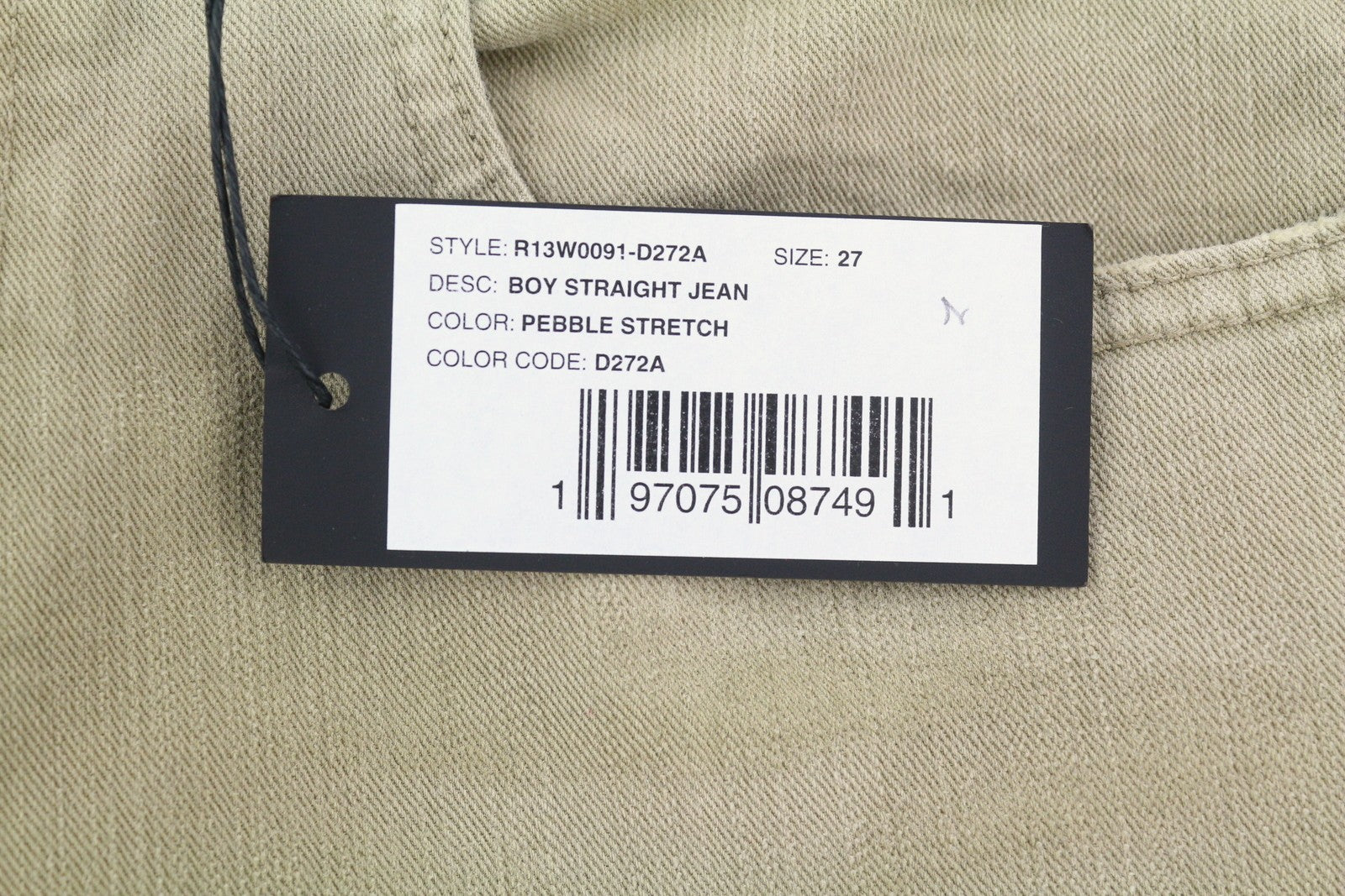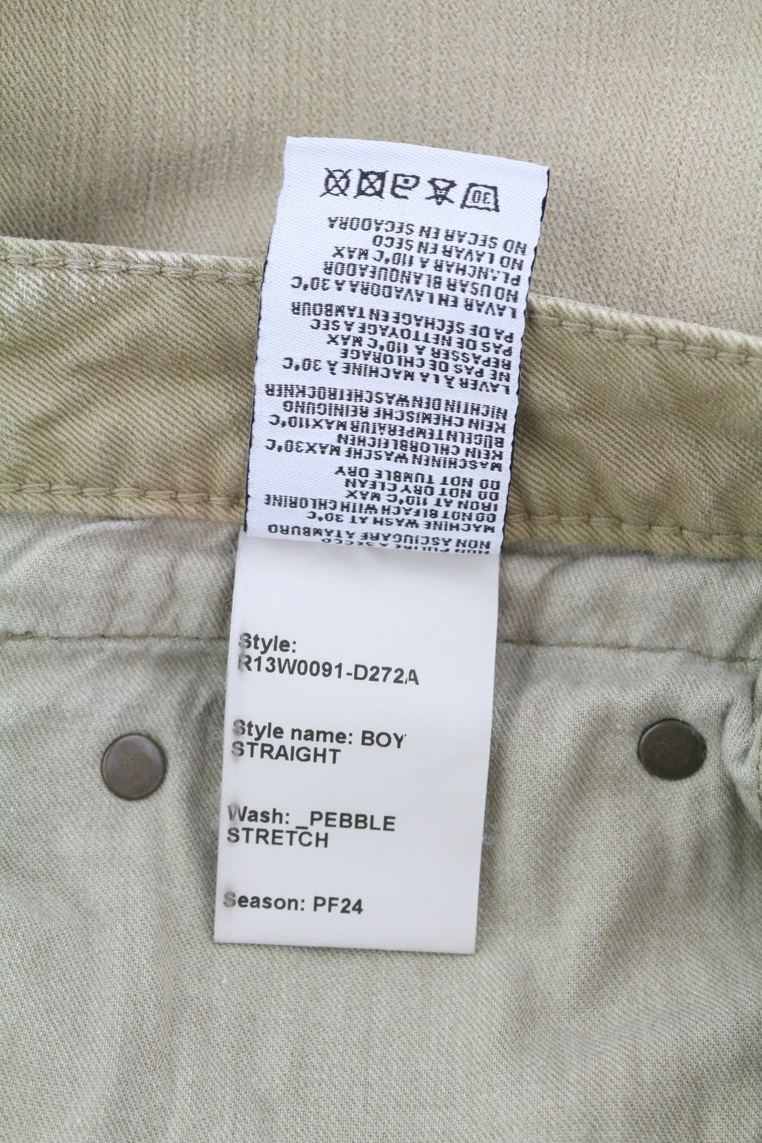 R13 berniukiški tiesūs moteriški džinsai 27 akmenukų ilgio, tamprūs, trumpinti, išblukintos rudos spalvos, rekomenduojama kaina – 695 €