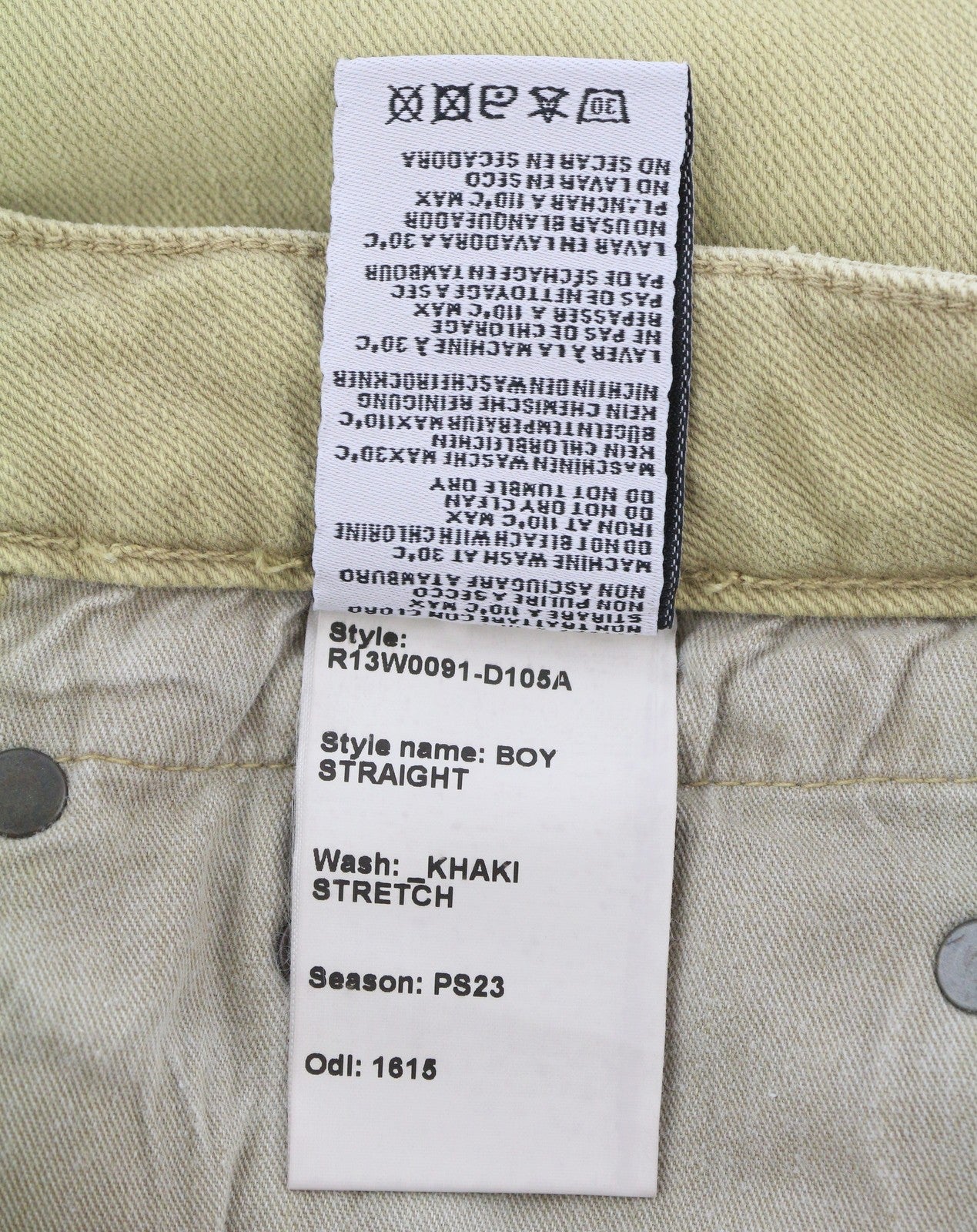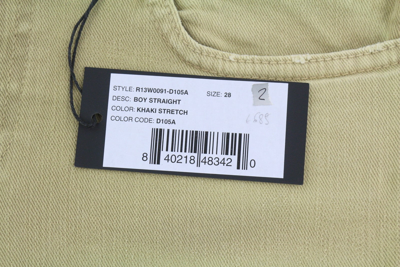 R13 berniukiški tiesūs moteriški džinsai, 28 chaki spalvos, tamprūs, trumpi, šviesiai džinsiniai, iki kulkšnių, rekomenduojama kaina – 699 €