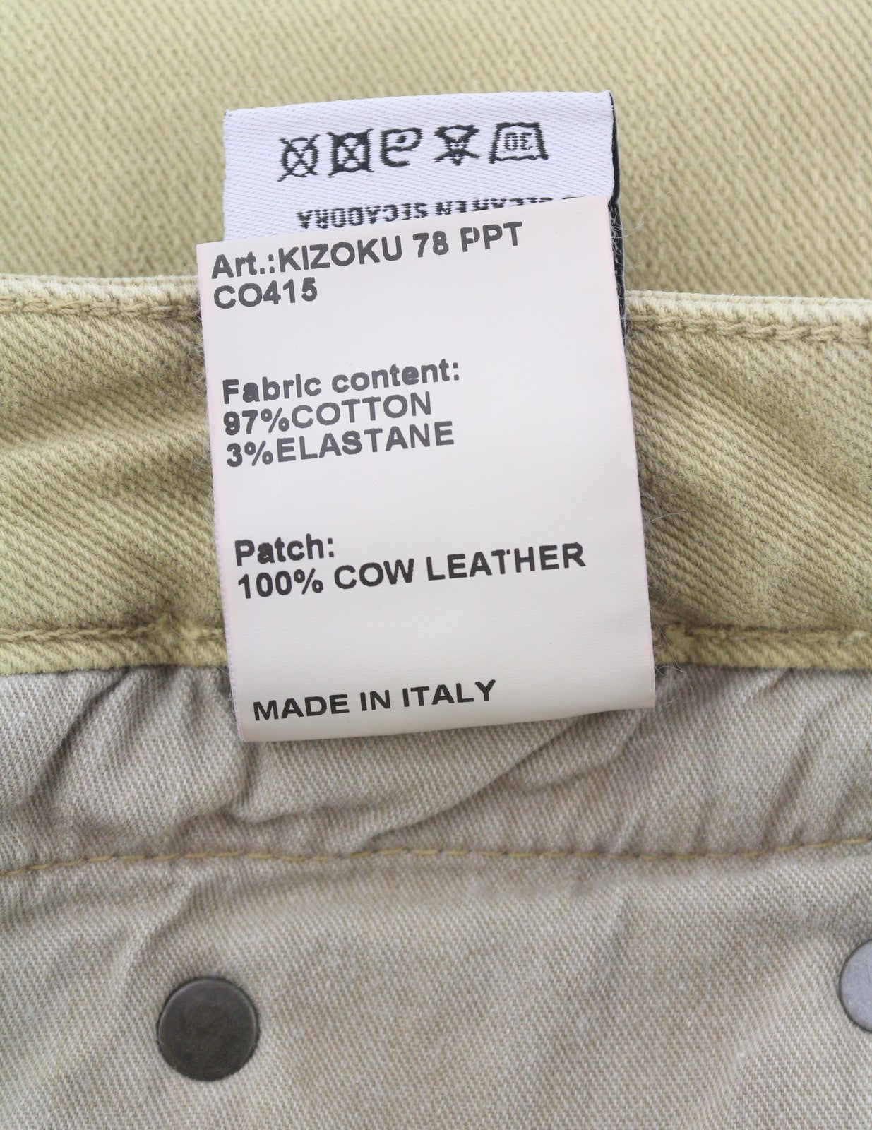 Slightly discoloured on the right leg. The material is slightly waved (elastane is stretch out) in a few places. Please see added photos.