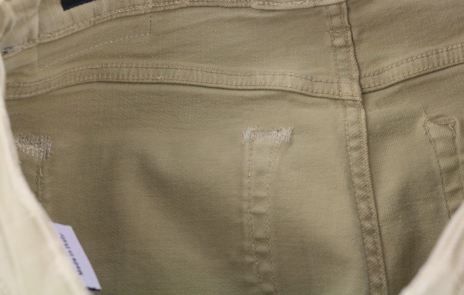 Slightly discoloured in places. Small holes on the back pocket corners. A professional seamstress repaired the defects on the back pockets corners. The material is slightly waved (elastane is stretch out) in a few places. Please see added photos.