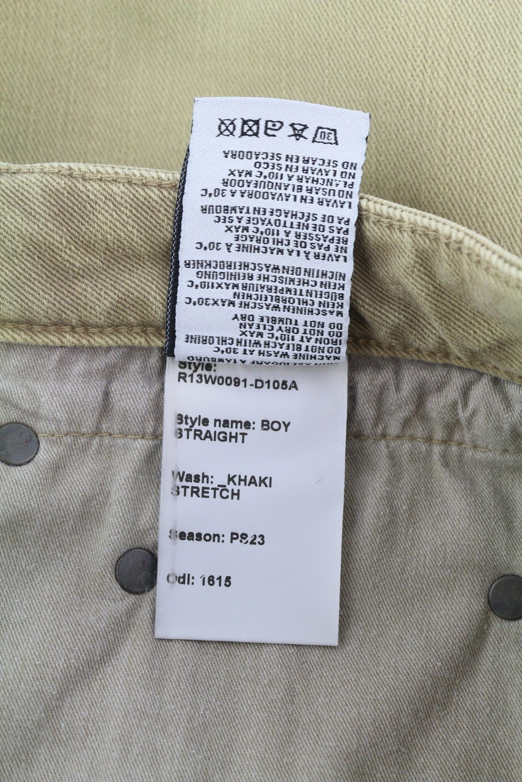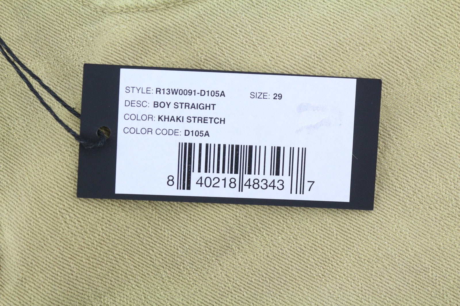 R13 berniukiški tiesūs moteriški džinsai, 29 m. skalbti chaki spalvos, tamprūs iki kulkšnių, rekomenduojama kaina – 645 €