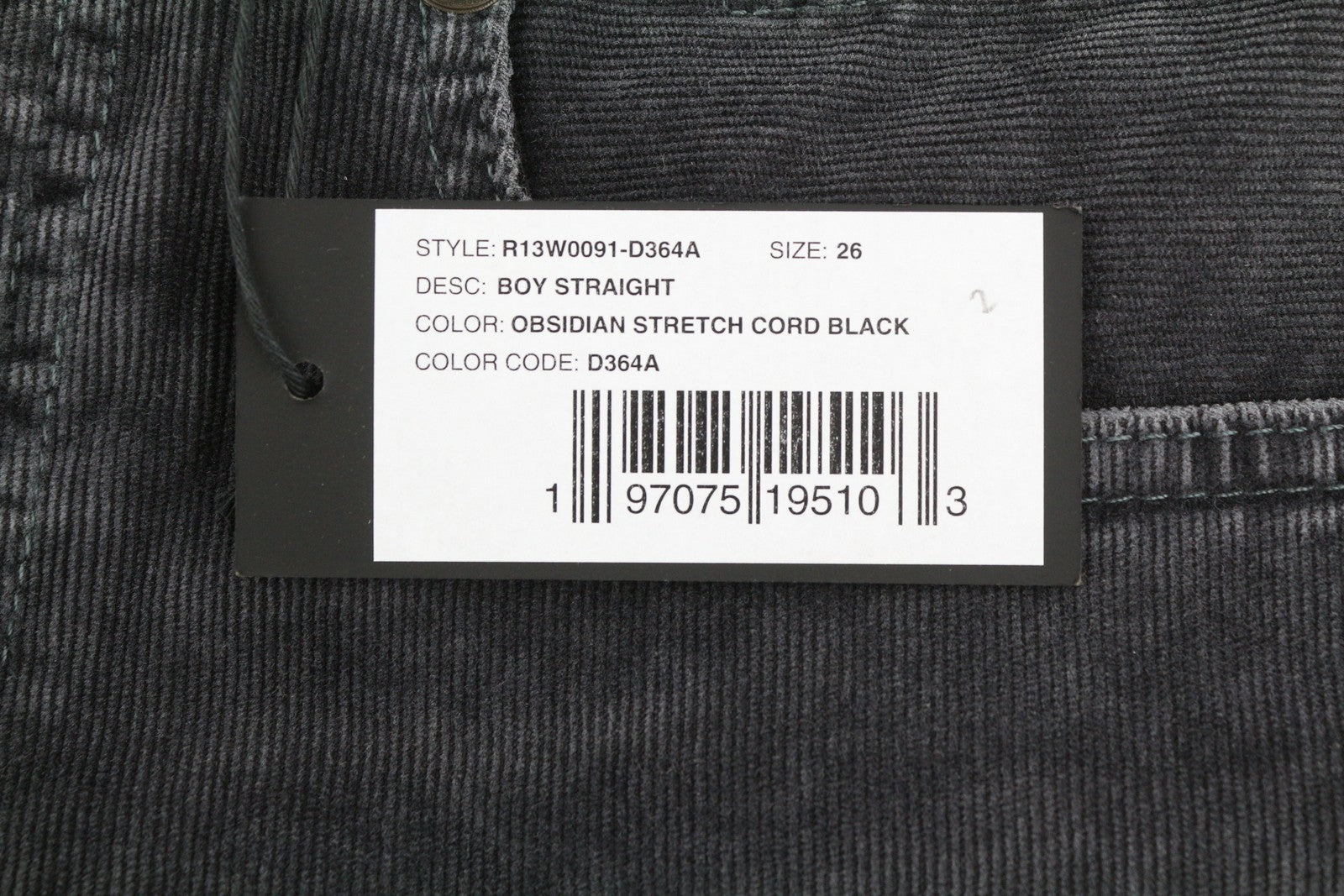 R13 berniukiškos tiesios moteriškos kelnės 26 obsidiano spalvos su tampria virvele, trumpintos, išblukintos, FW25