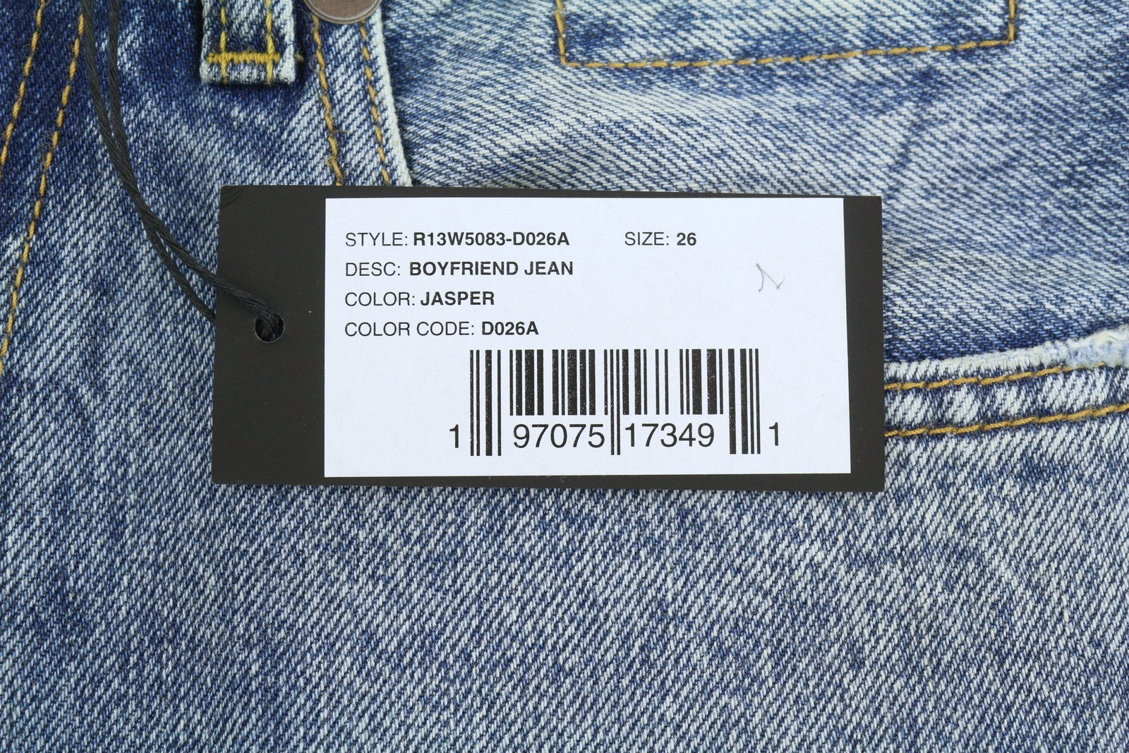R13 Boyfriend moteriški džinsai 26 Jasper tiesūs trumpi ūsai išblukusi mėlyna PF25