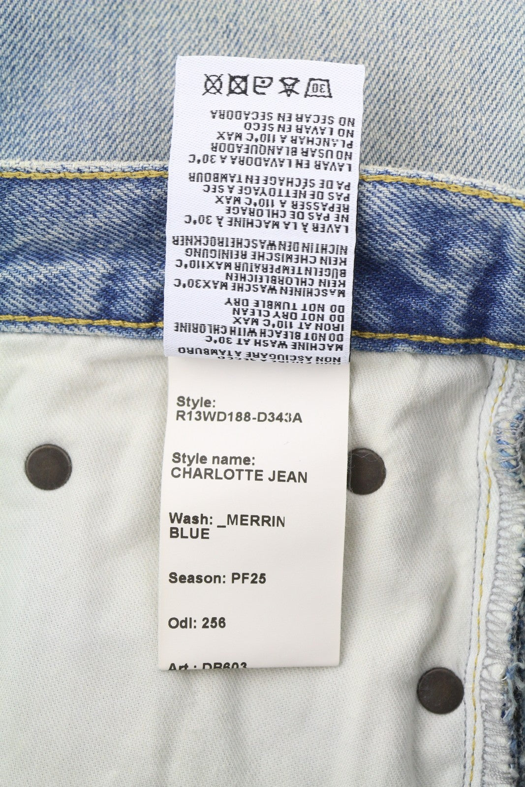 R13 Charlotte moteriški džinsai 24 Merrin mėlyni aukšta juostele, platėjančiomis klešnėmis, išblukintos PF25 RRP795