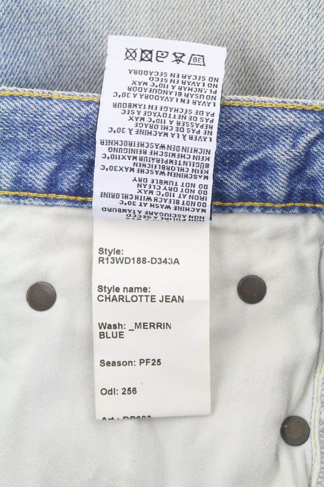 R13 Charlotte moteriški džinsai 28 Merrin mėlyni aukšta juostele, platėjančiomis klešnėmis, išblukintos PF25 RRP795