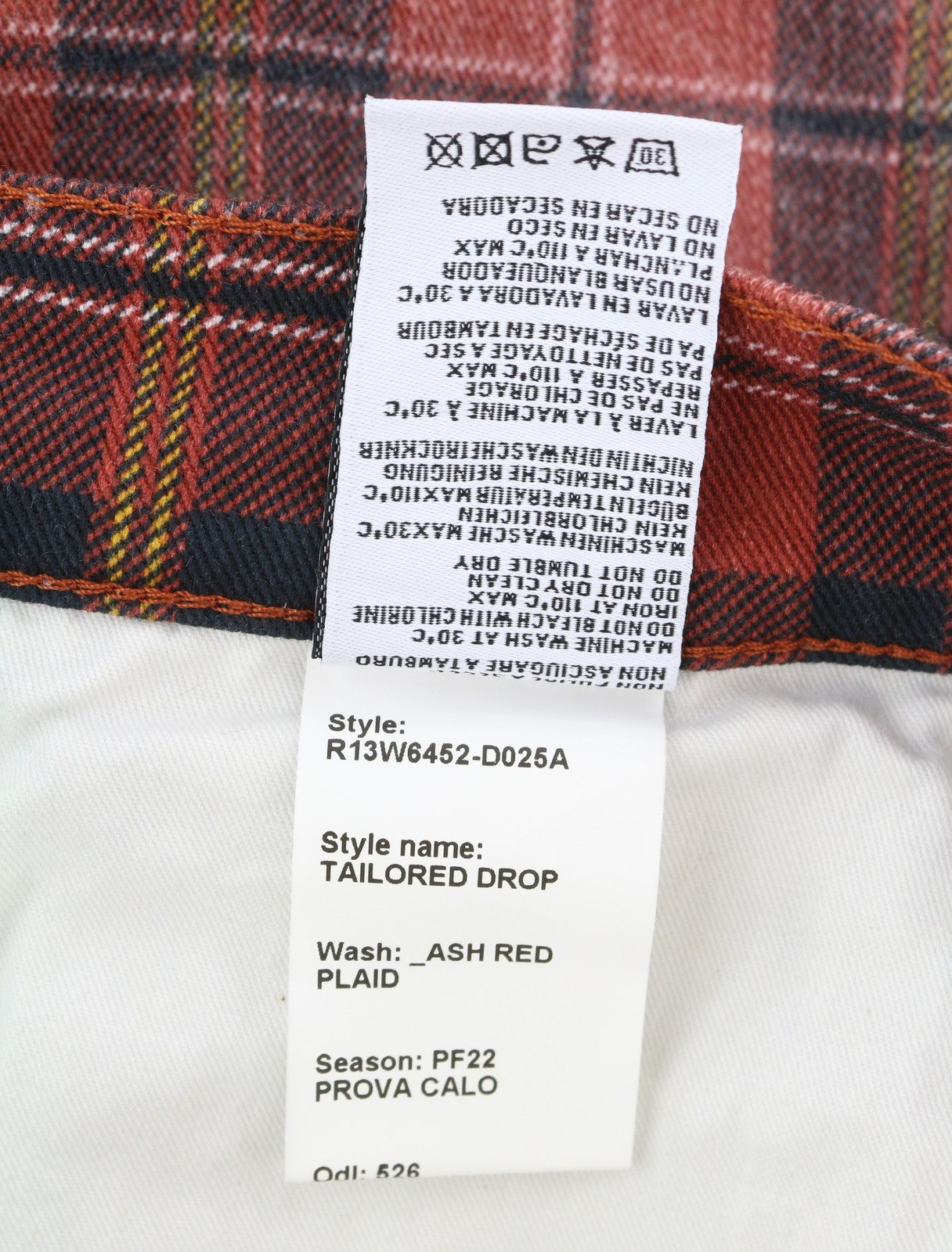 R13 Pasiūtos moteriškos kelnės 27 pelenų raudonumo, languotos, trumpintos, nuleistos iki kulkšnies ir tarpkojo.