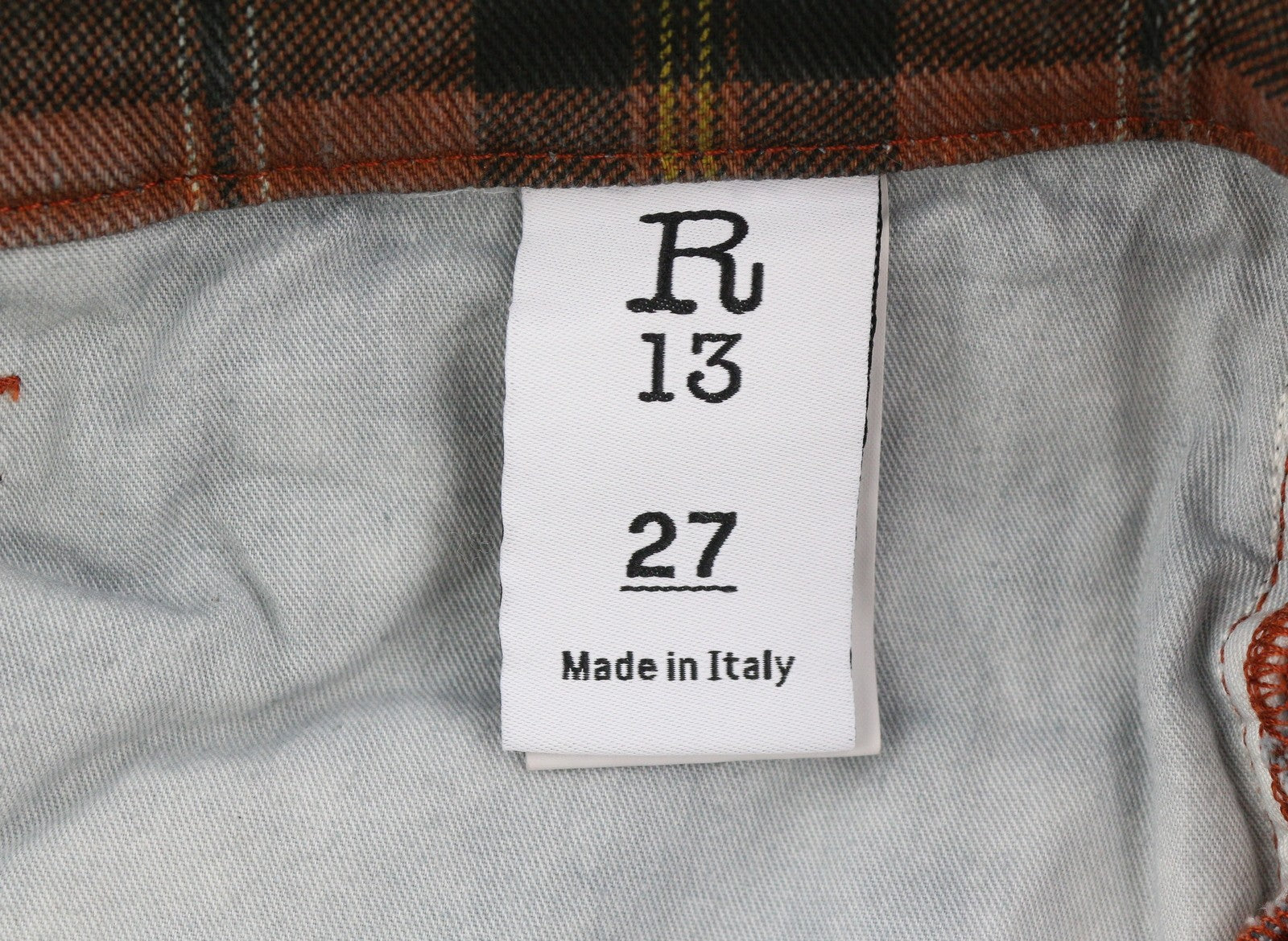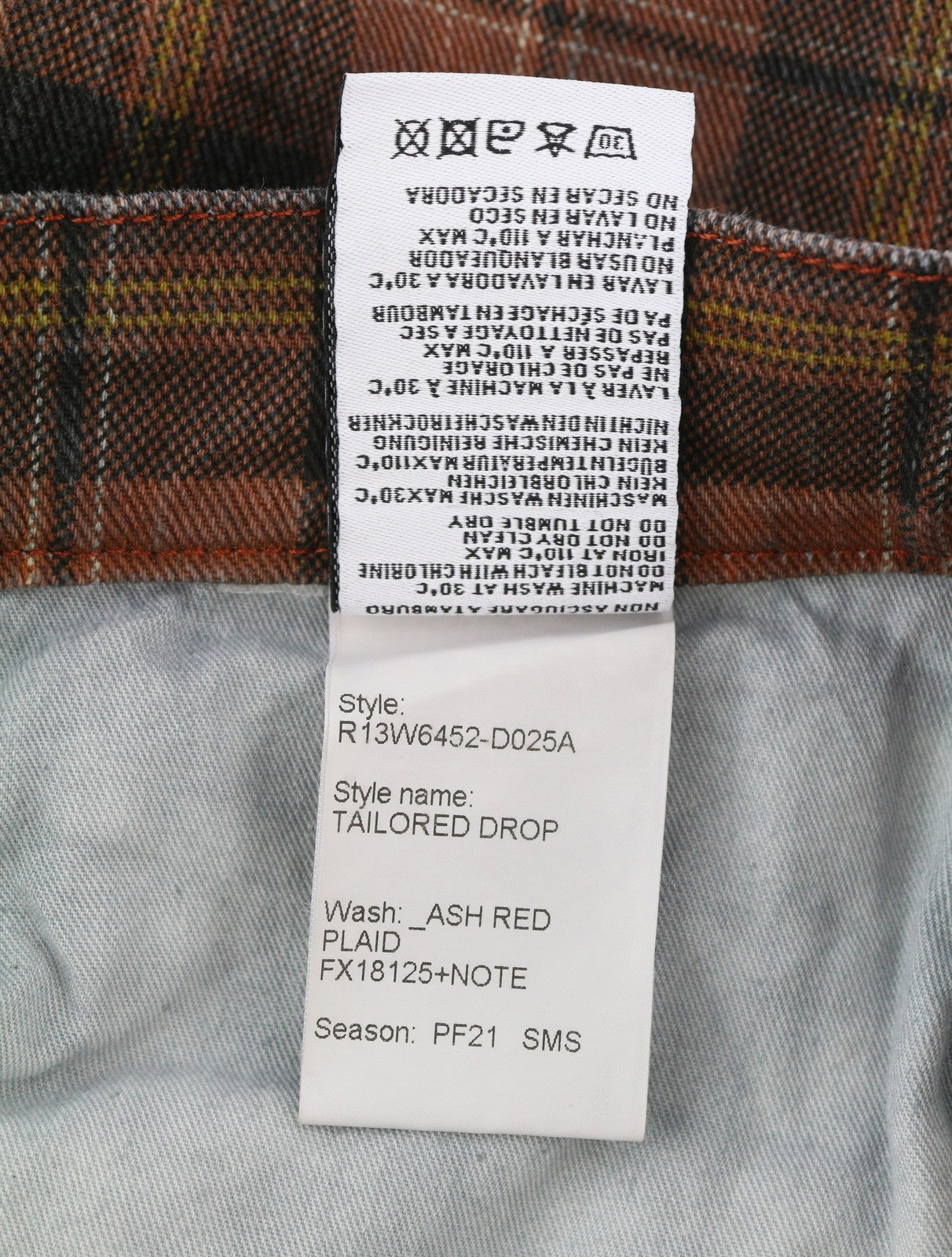 R13 Pasiūtos moteriškos kelnės, 27, pelenų raudonumo, languotos, trumpos, laisvo kirpimo, iki kulkšnių.