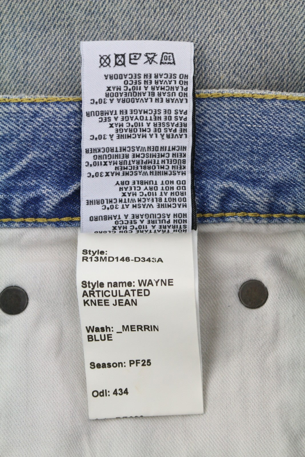 R13 Wayne moteriški džinsai su sąnariais ir keliais, 32 Merrin mėlyni, PF25 klostėmis, laisvi, RRP799