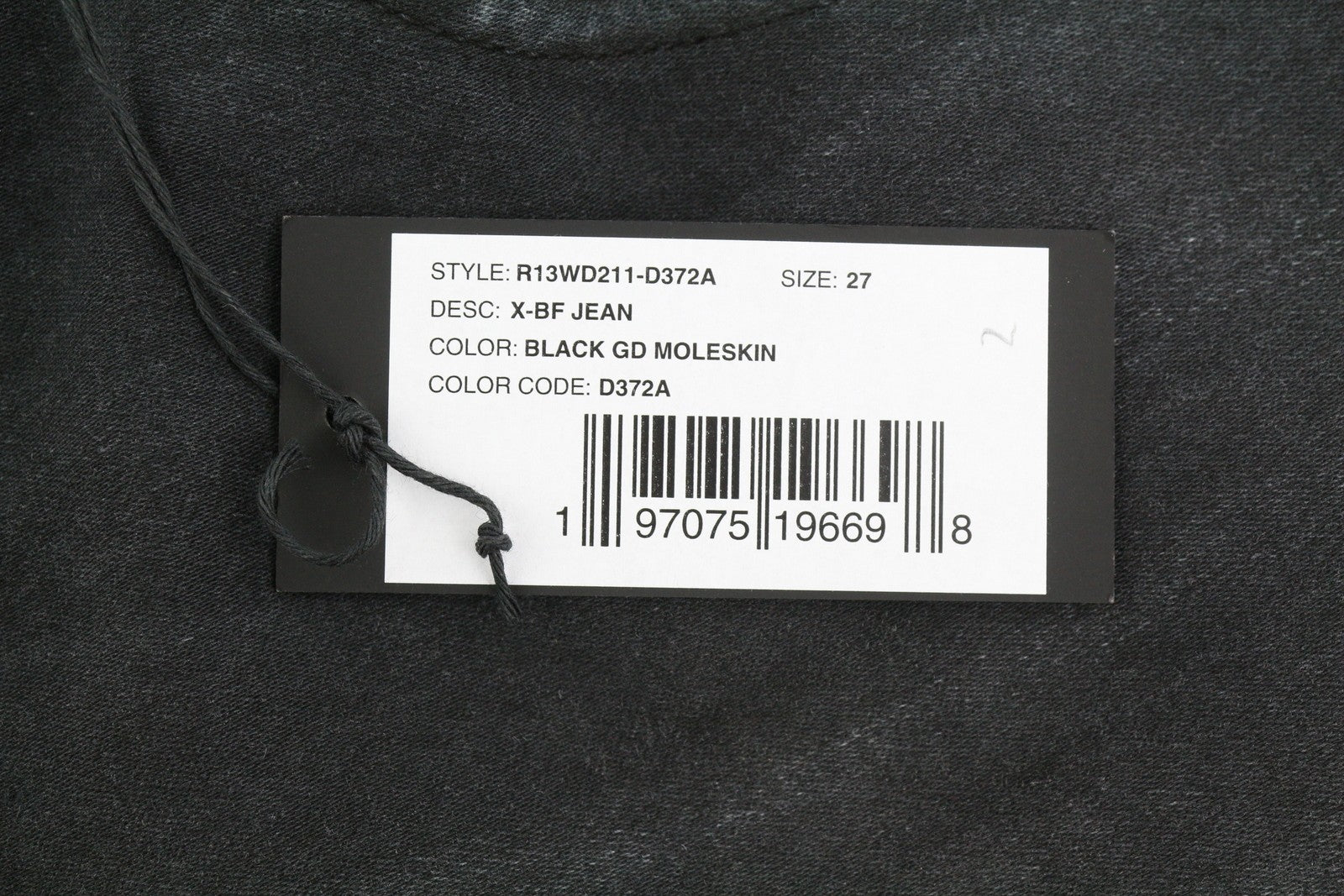 R13 X-BF moteriški džinsai 27 juodi dažyti moleskino trumpinti džinsai su užtrauktuku FW25