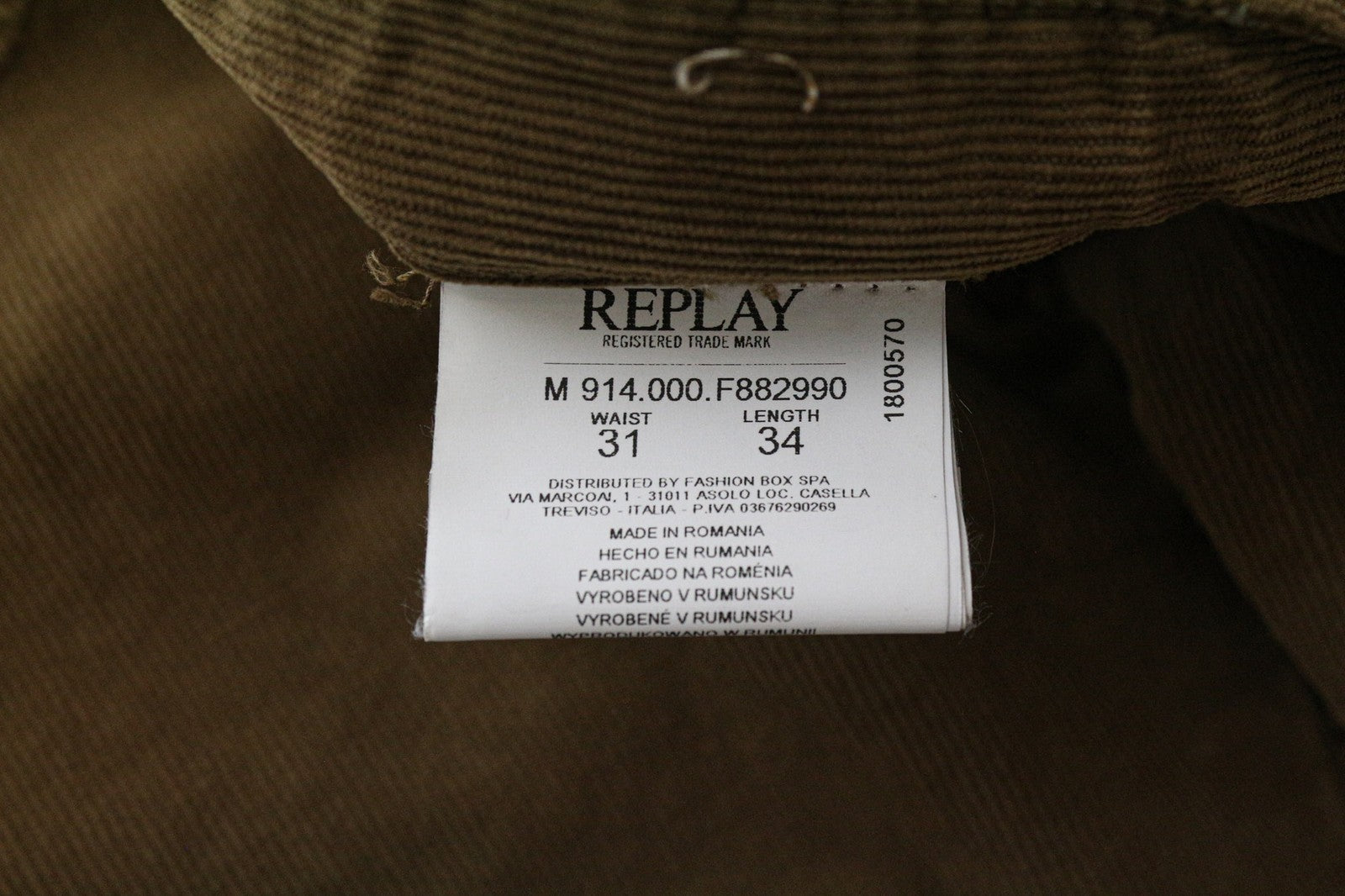 REPLAY Anbass Men's Corduroy Trousers W31/L34 Slim Fit Brown Stretch Cotton