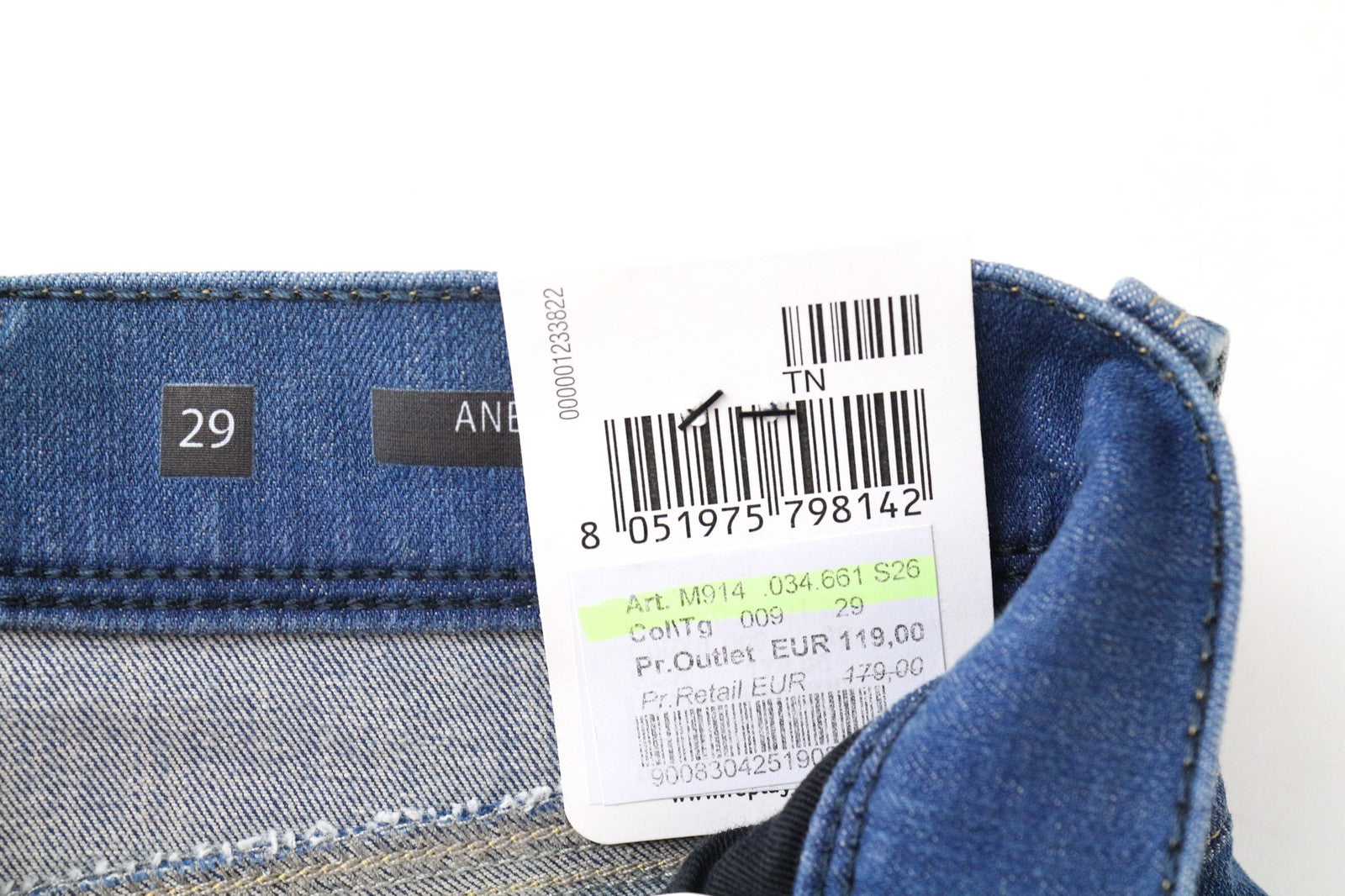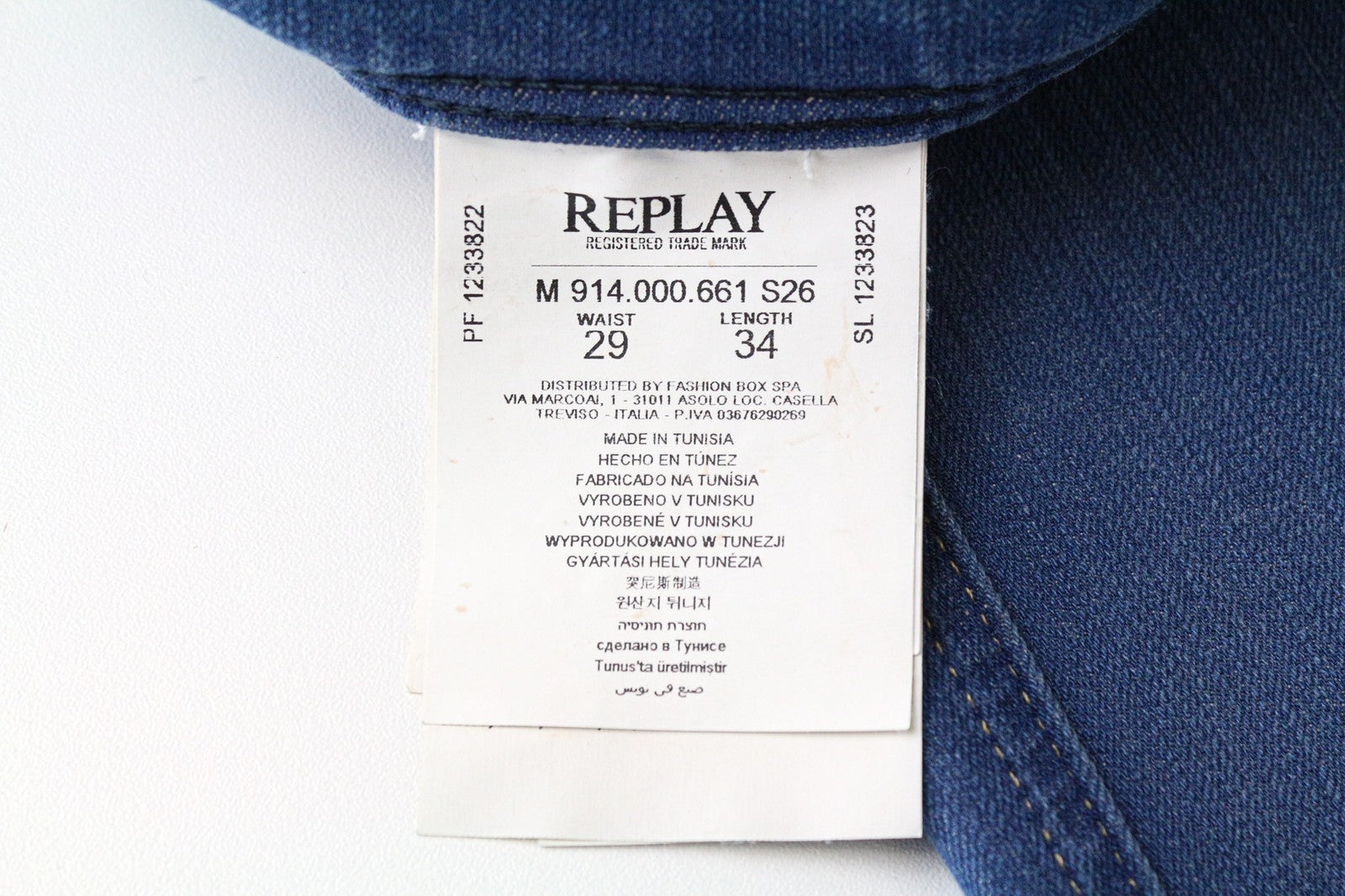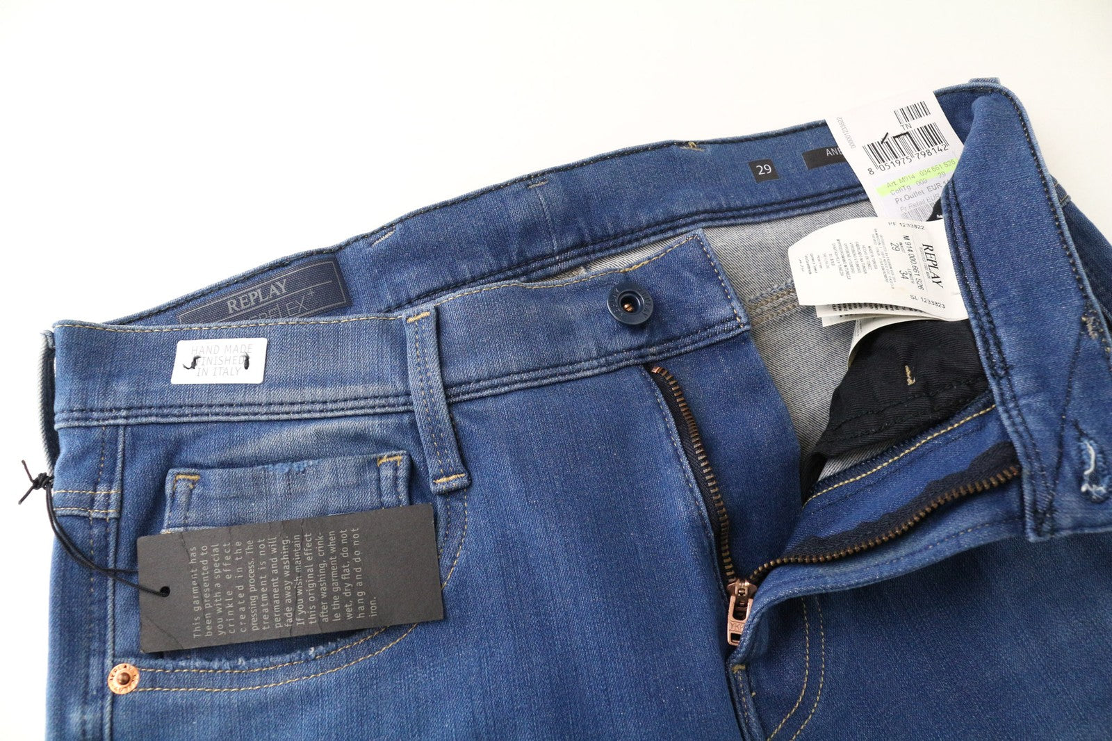 REPLAY Anbass vyriški džinsai W29/L34 vidutinio mėlynumo, ploni, „Hyperflex+“ užtrauktuku, tamprūs, džinsiniai