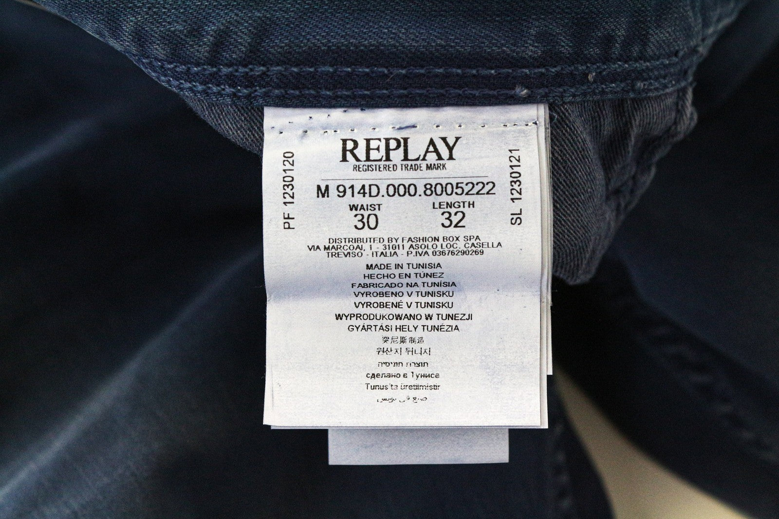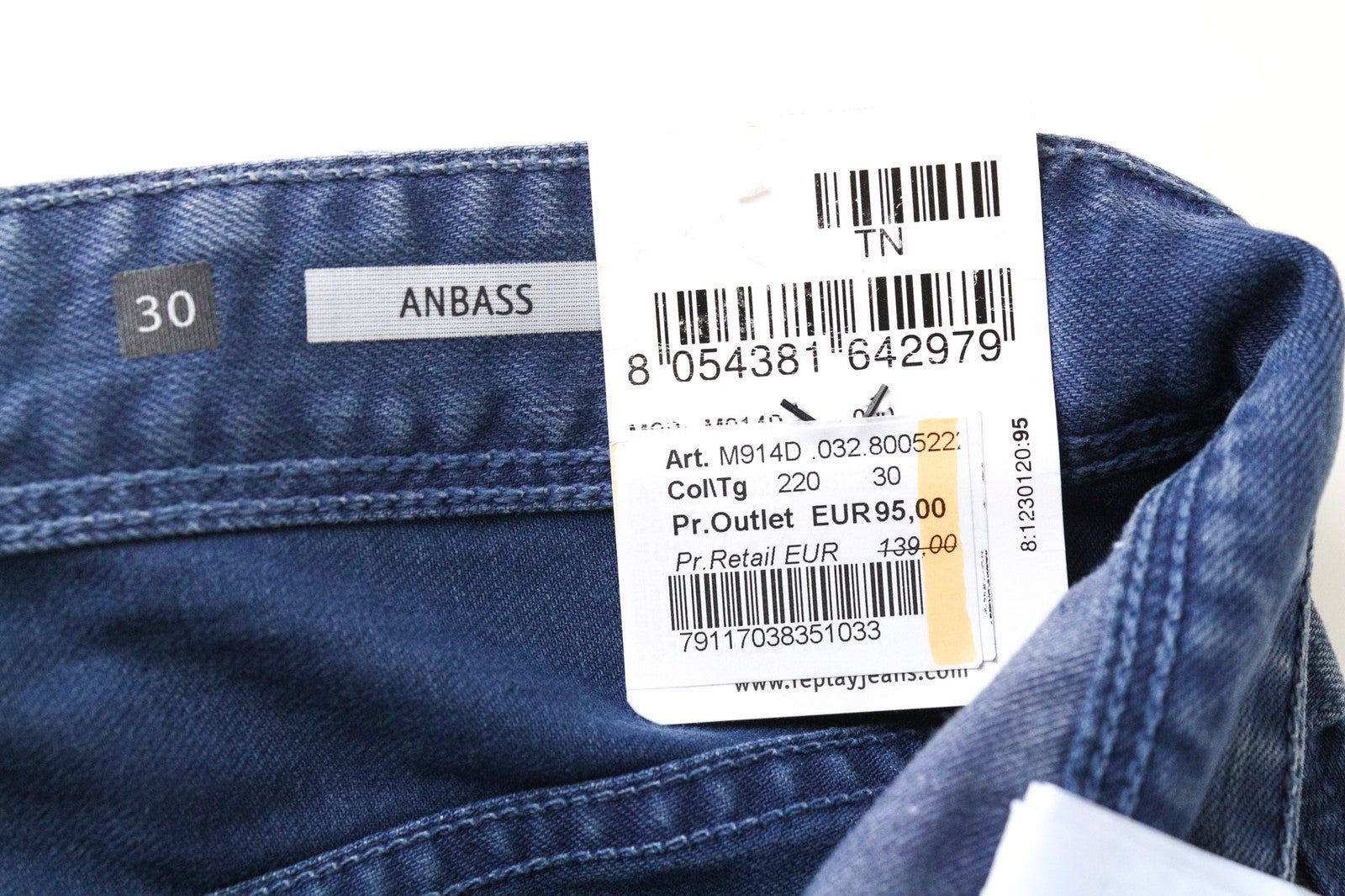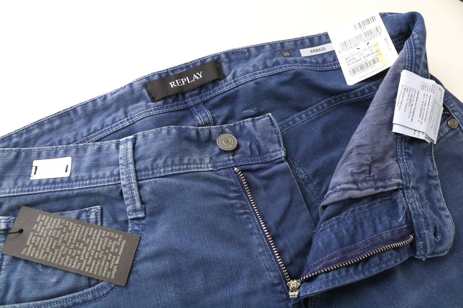 REPLAY Anbass vyriški džinsai W30/L32 Slim mėlyni medvilniniai tamprūs laisvalaikio stiliaus džinsai su 5 kišenėmis