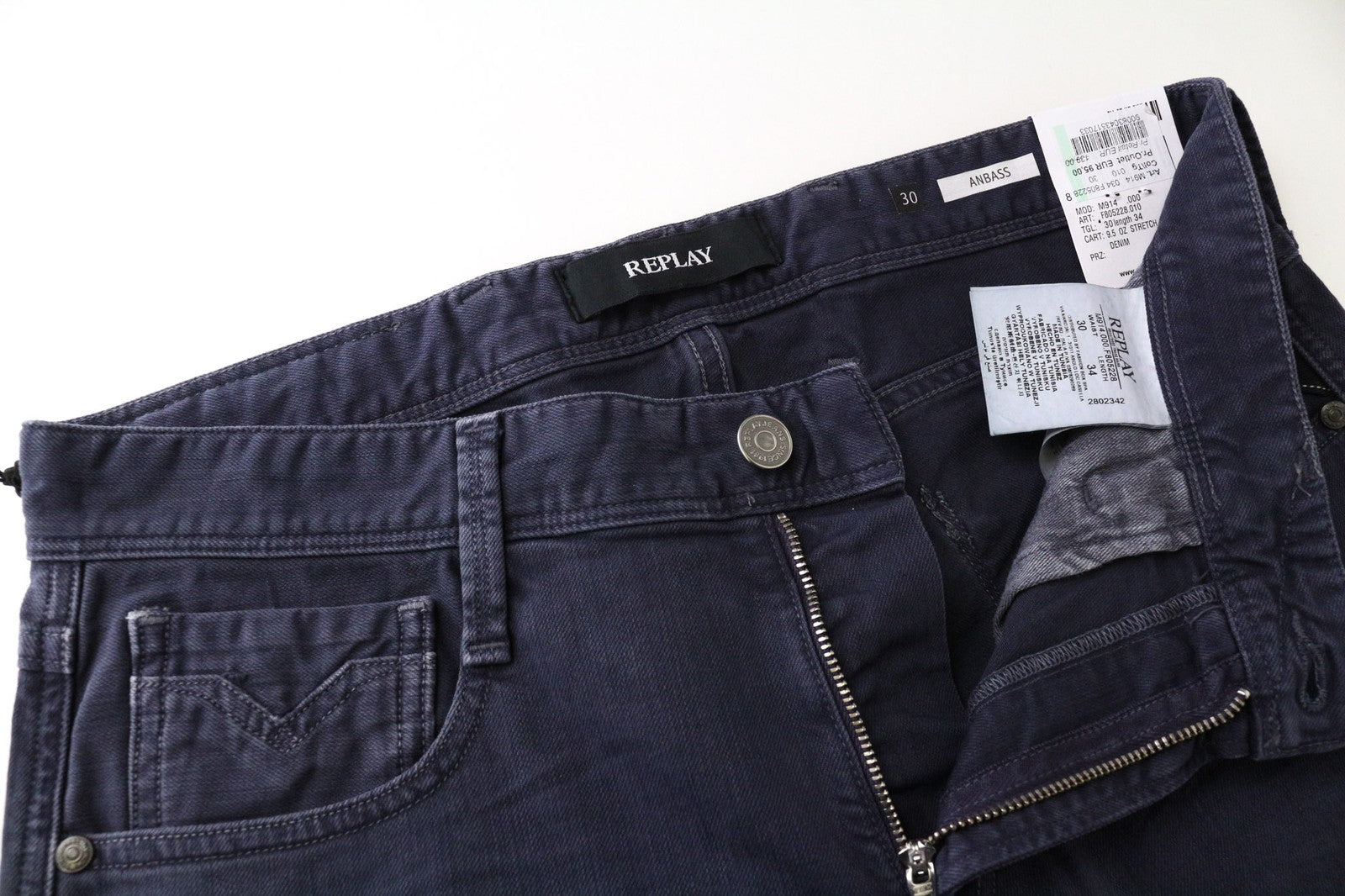 REPLAY Anbass vyriški džinsai W30/L34 violetiniai, ploni, klasikinio tamprumo, džinsinio audinio, su užtrauktuku, laisvo kirpimo