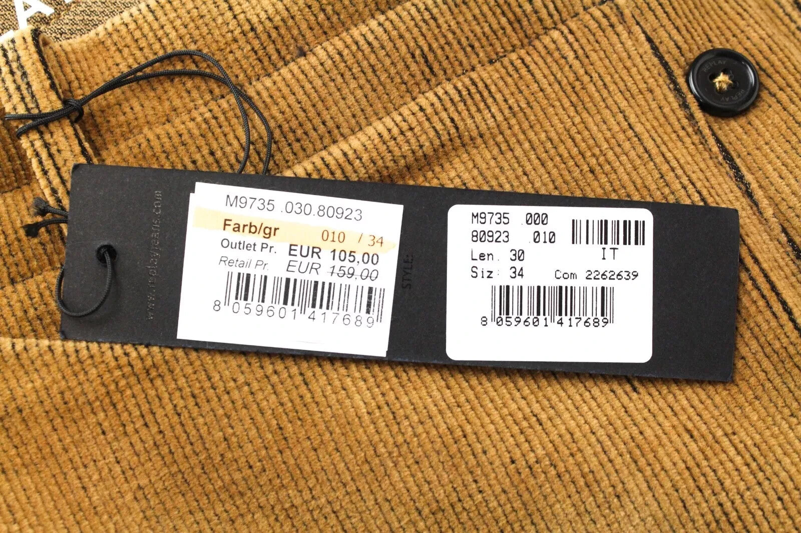 REPLAY Chino Pants W34 L30 Brown Corduroy Patched Pocket Button-Fly Men