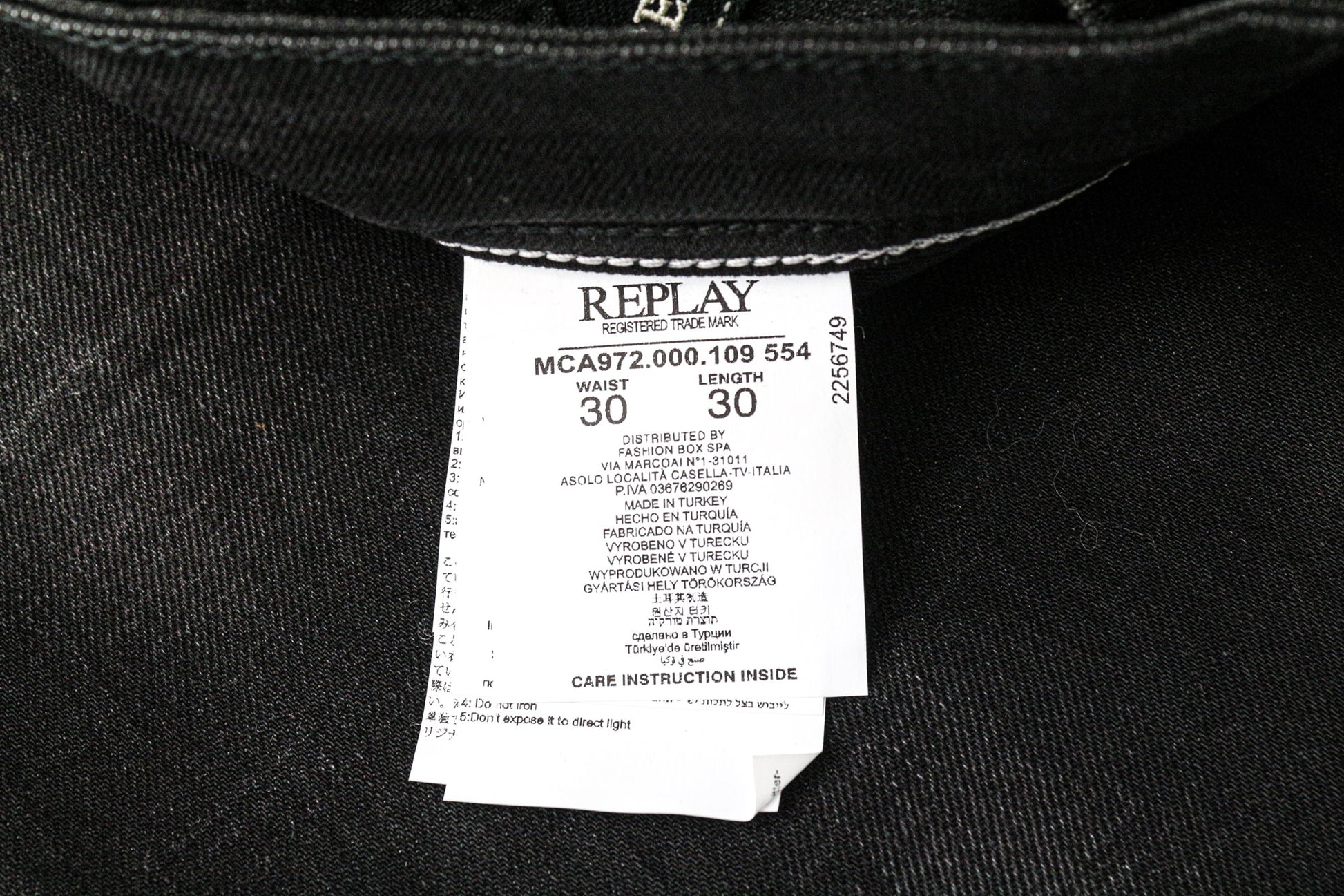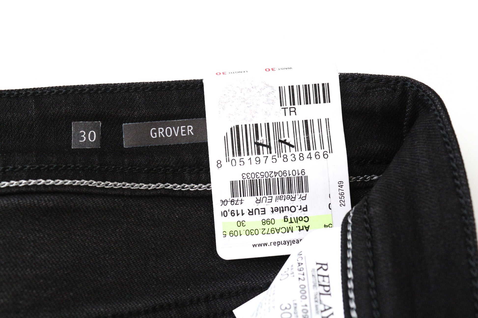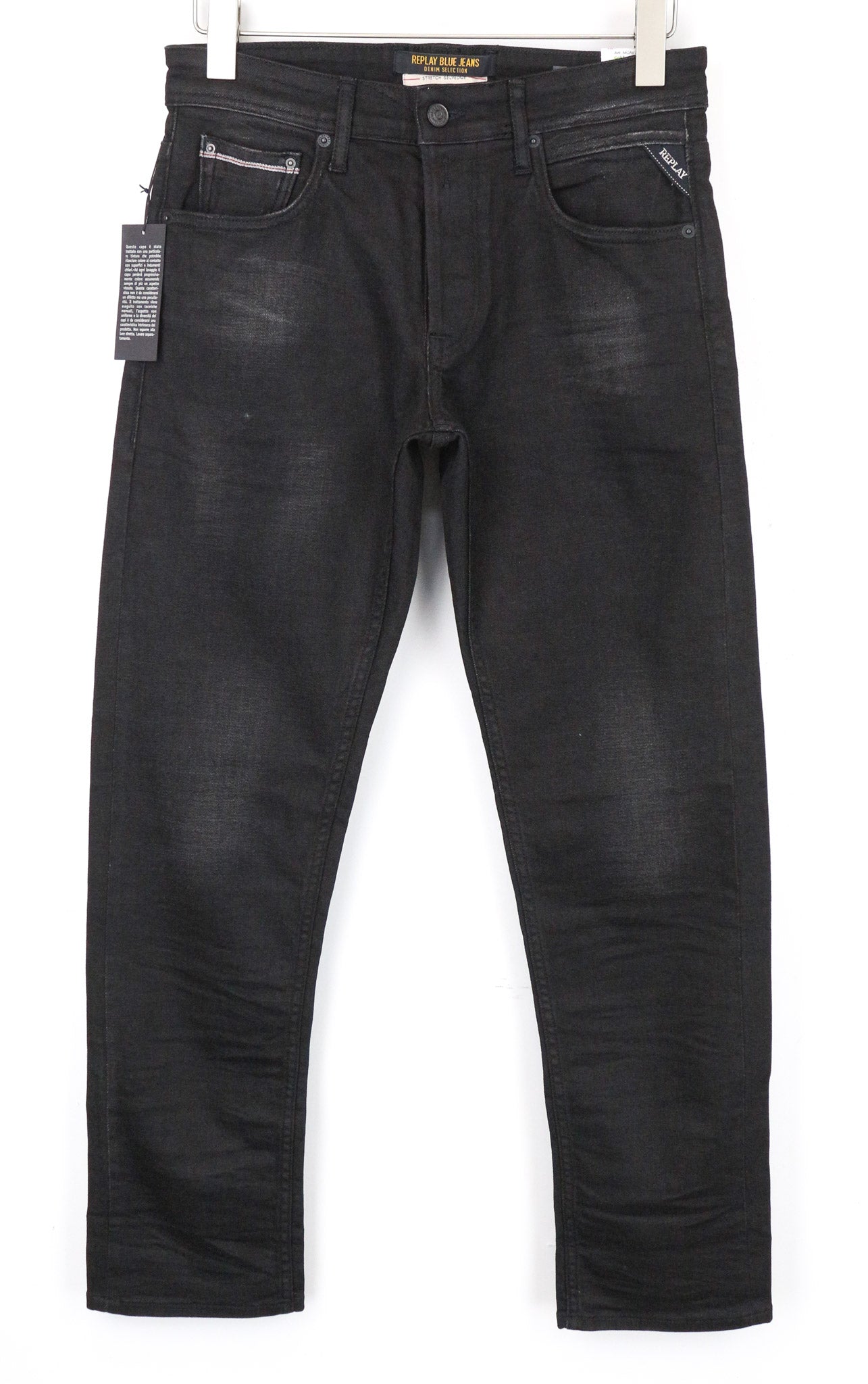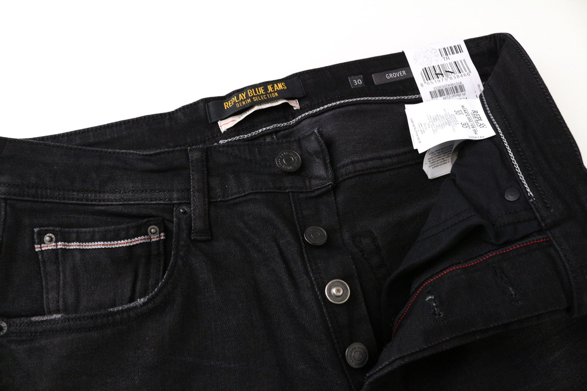 REPLAY Grover vyriški džinsai W30/L30 juodi tiesūs, tamprūs kraštai su sagomis