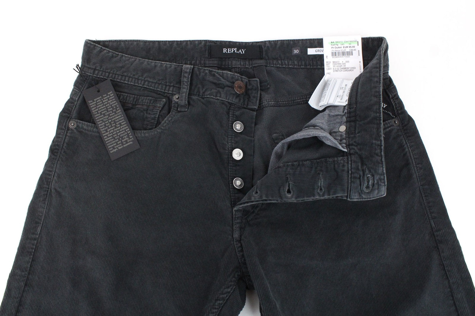 REPLAY Grover Men's W30/L34 Dyed Grey Corduroy Velvet Straight Trousers