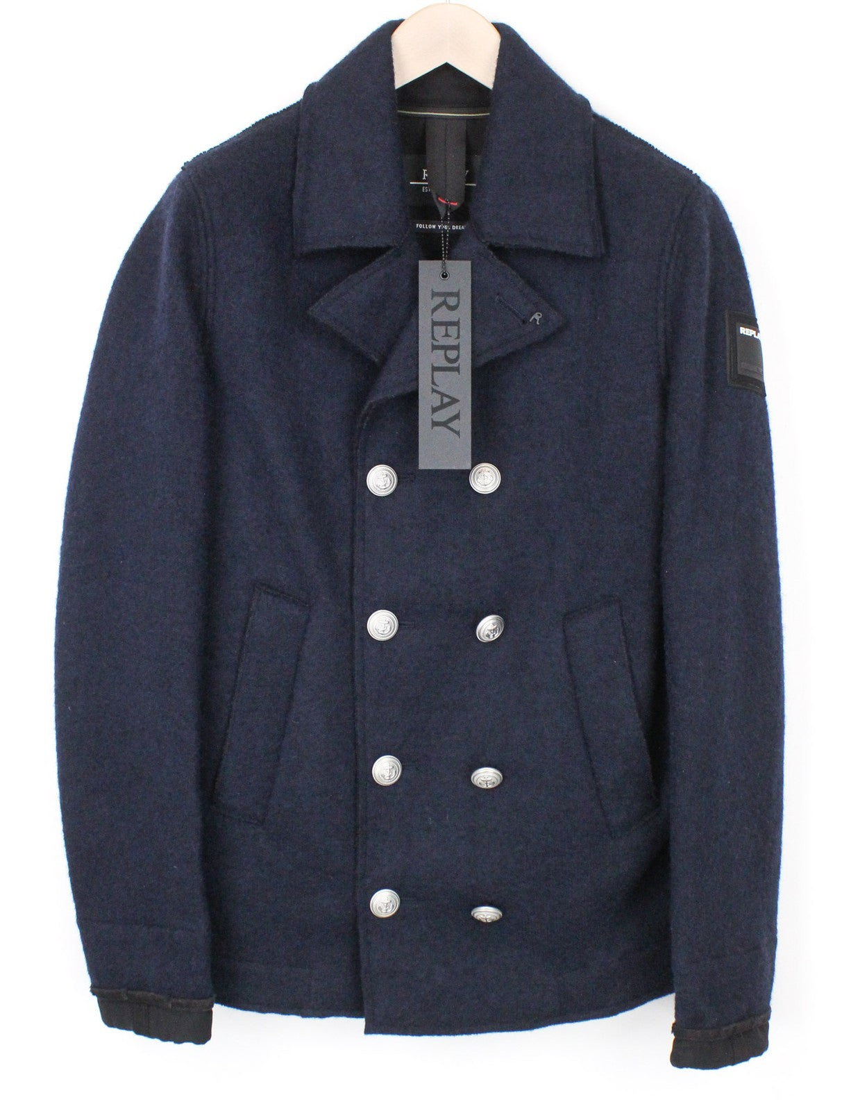 REPLAY Men's Navy XL Wool Blend Coat Classic Double-Breasted Notch Slim Lined