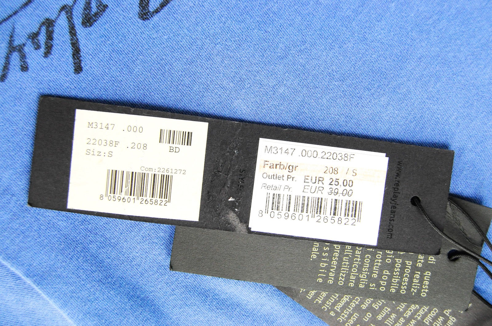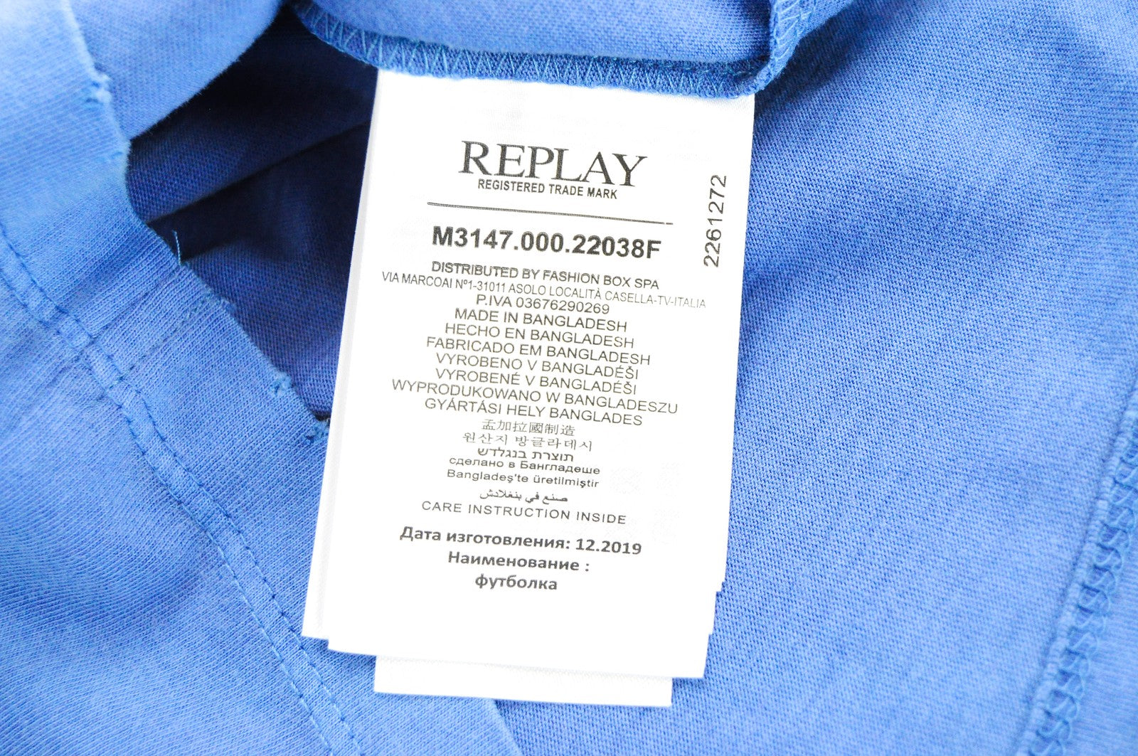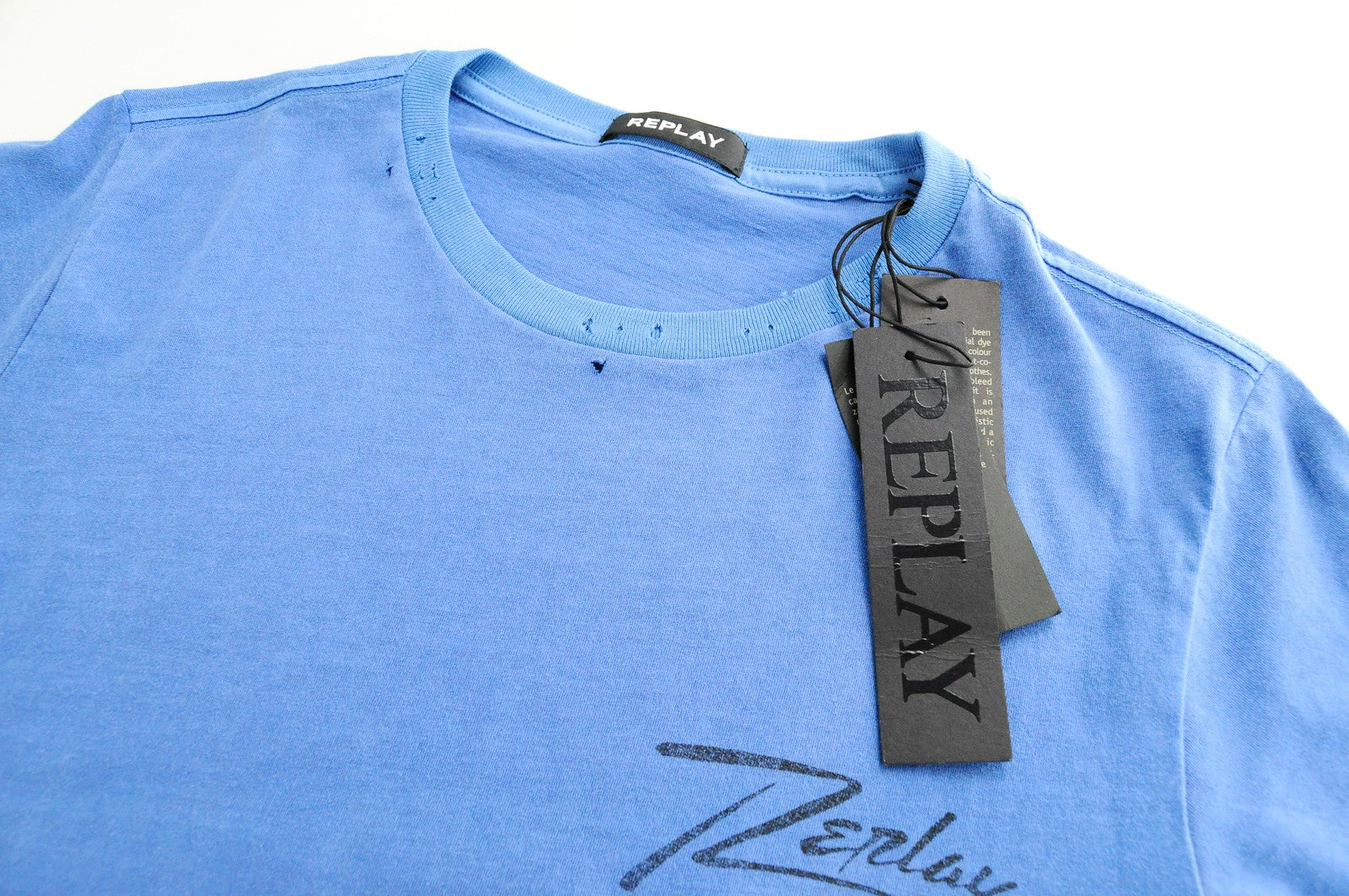 REPLAY vyriški marškinėliai S dydžio trumpomis rankovėmis, mėlyni medvilniniai plėšyti megztiniai