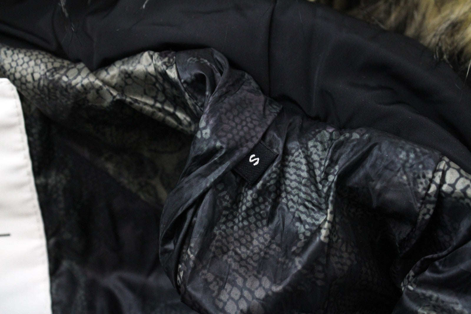 REPLAY S juoda dirbtinio kailio paminkštinta moteriška parka su gobtuvu, pamušalu ir užtrauktuku