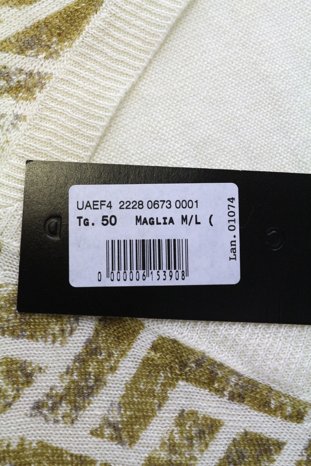 RICHMOND vyriškas megztinis IT50 kreminės spalvos lininis megztinis su V formos iškirpte ir geometrinio rašto raštu