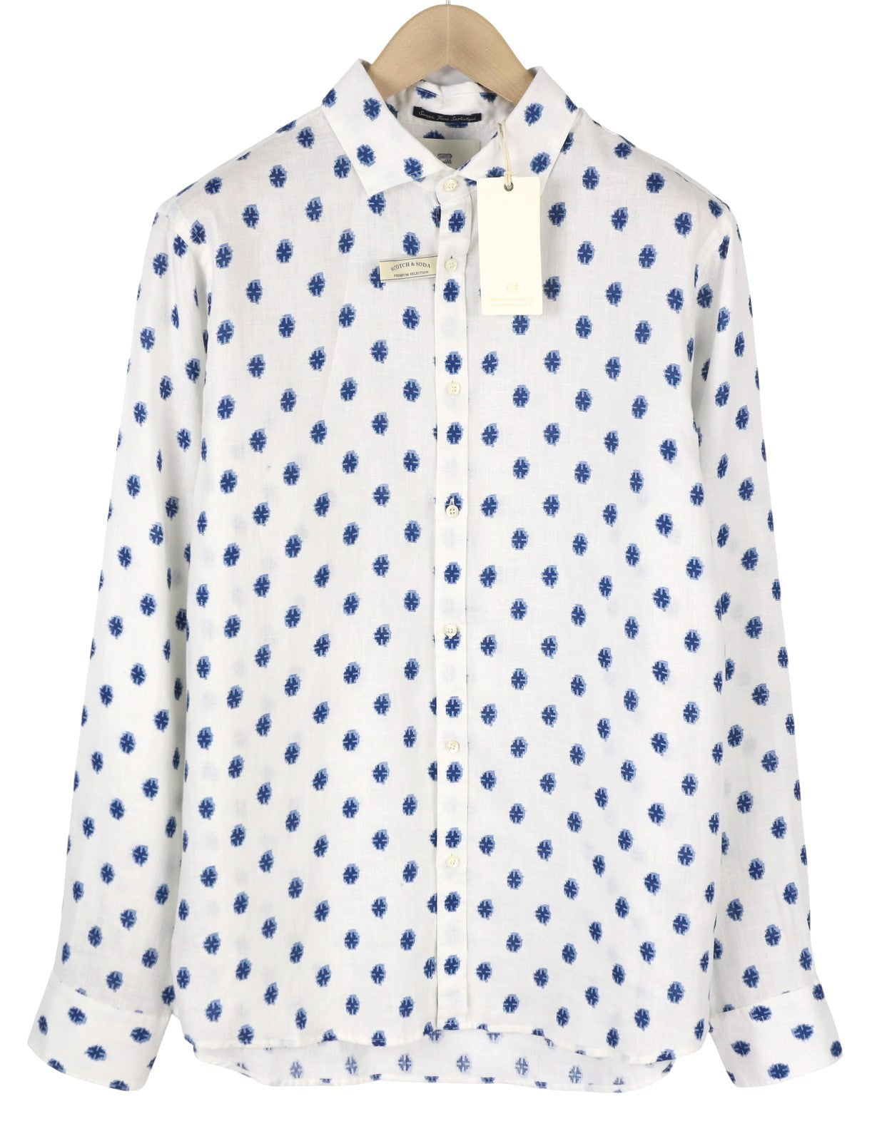 SCOTCH & SODA vyriški XL dydžio balti raštuoti lininiai marškinėliai su sagomis ir laisvalaikio logotipu