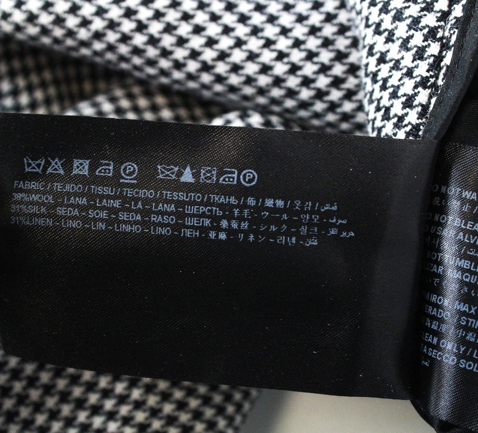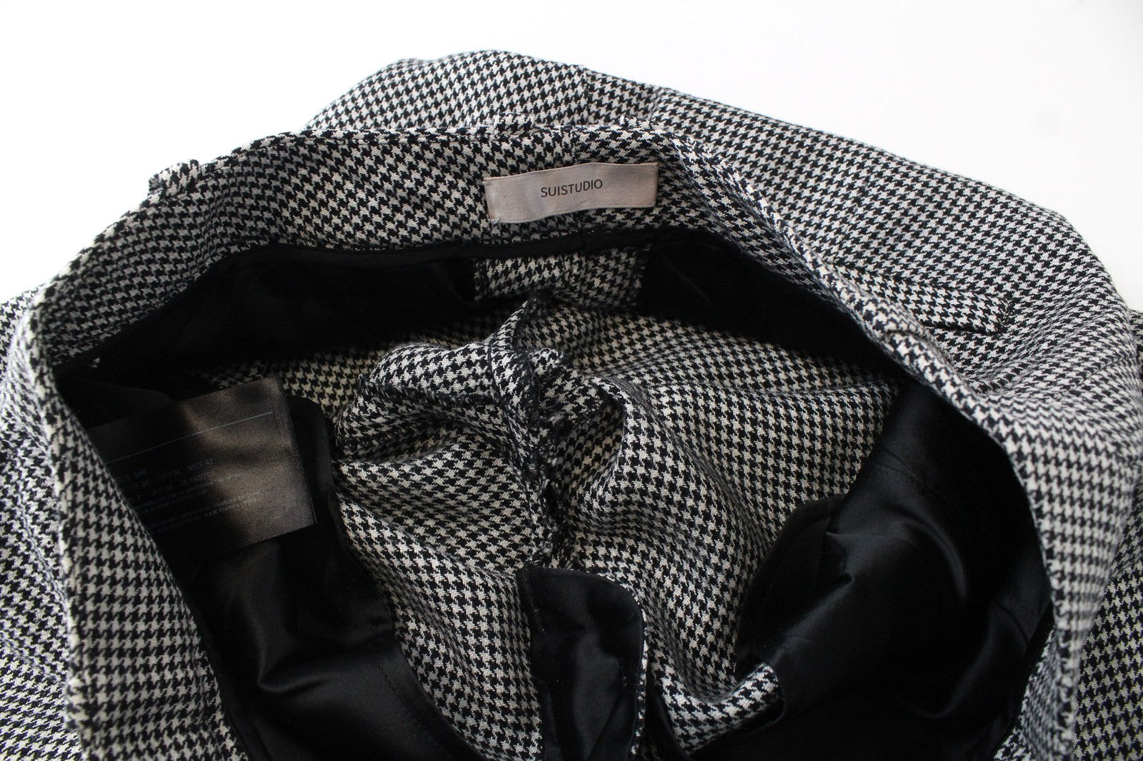 SUISTUDIO pilkos moteriškos kelnės UK8R vilnos, šilko, lino, prigludusios, pilkos, „Houndstooth“ rašto.